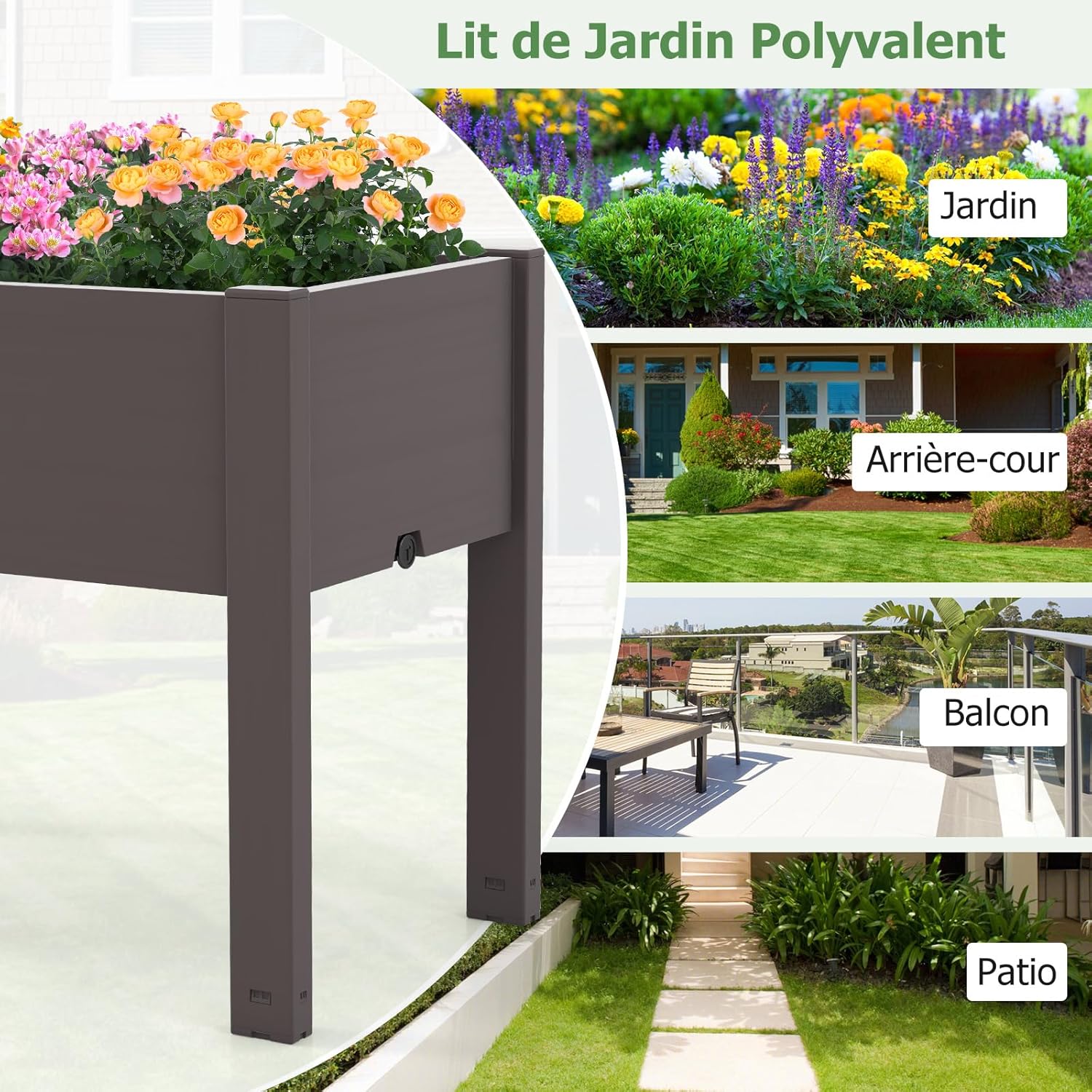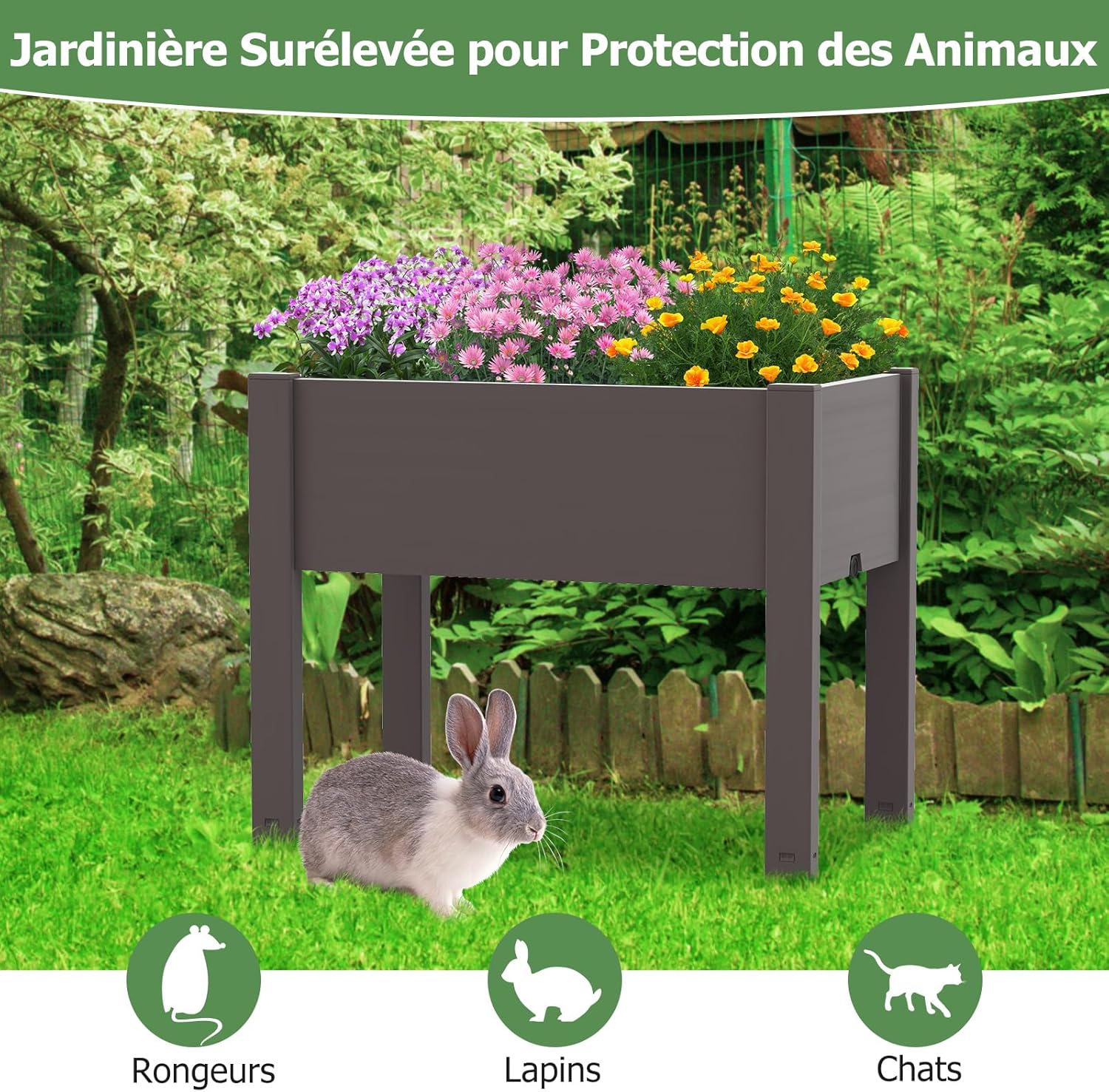 - Jardinière Surélevée à Espaces Multiples : notre jardinière polyvalente est idéale pour une utilisation dans un jardin, une cour arrière, un balcon ou une terrasse, qui crée une barrière protectrice pour vos plantes. De plus, le design surélevé aide à éloigner les invités indésirables du jardin.