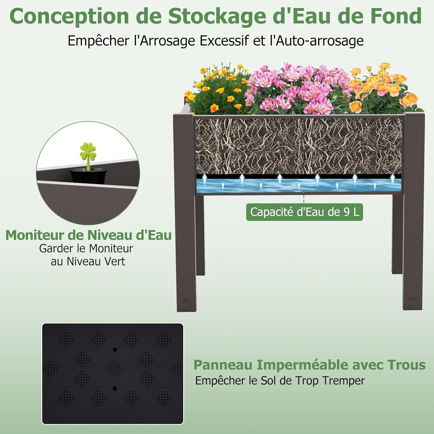- Design d'Auto-arrosage : Le design de stockage d'eau en bas avec une capacité de 9 L et un trou de drainage prévient l'excès d'eau et assure un auto-arrosage pour vous éviter le tracas d'un arrosage constant. De plus, le moniteur de niveau d'eau vous aide à suivre les niveaux d'eau et à maintenir une hydratation optimale des plantes.