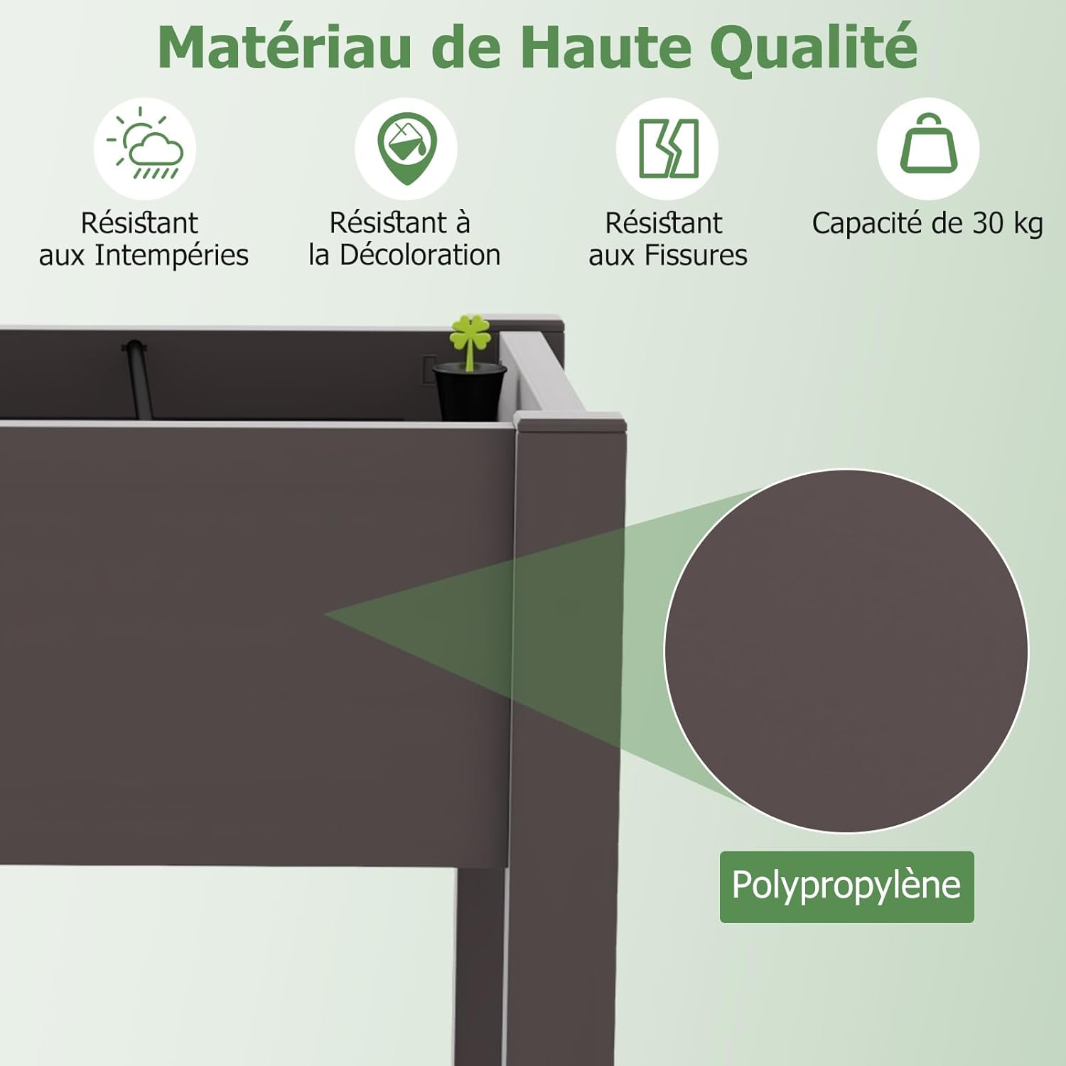 - Matériau de Haute Qualité : Fabriquée en matériau PP durable et de haute qualité, cette jardinière surélevée présente une grande résistance aux intempéries, à la décoloration et aux fissures pour une utilisation à long terme en extérieur.