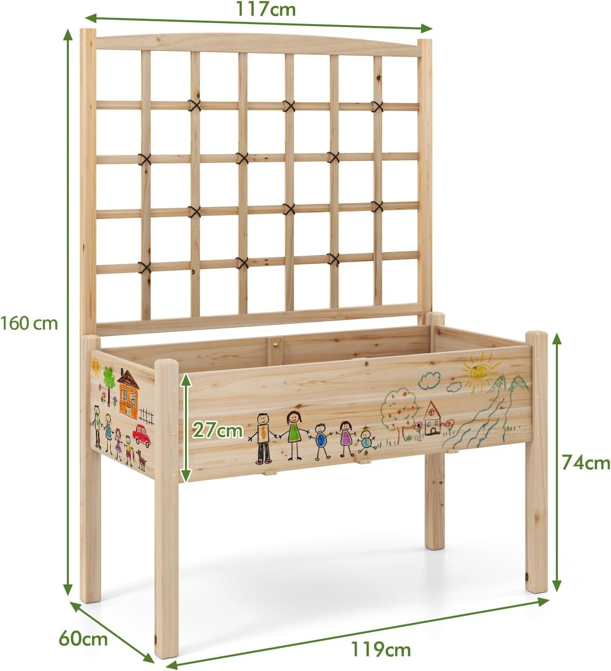 Il est fabriqué à partir de bois de sapin de première qualité, connu pour sa durabilité et sa résistance aux conditions difficiles. L'intérieur spacieux offre amplement de place pour cultiver une large gamme de plantes, des légumes luxuriants aux fleurs magnifiques. De plus, le treillis intégré est idéal pour soutenir les plantes grimpantes et embellir votre espace. Le bac de plantation comprend 4 trous de drainage, assurant une gestion optimale de l'excès d'eau, maintenant vos plantes en bonne santé et florissantes.