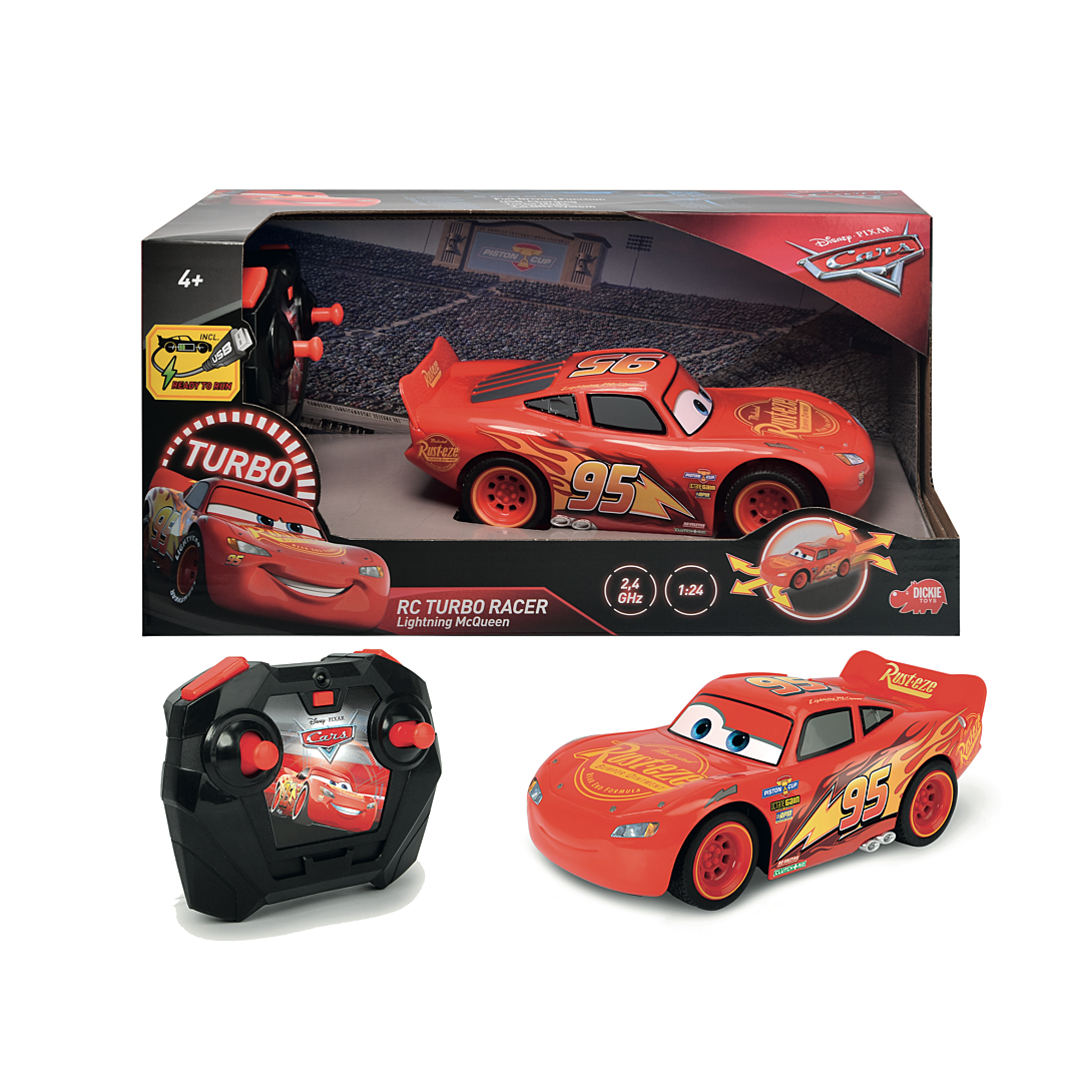 Plus produit Voiture RC Flash McQueen échelle 1/24. Télécommande avec fonctions complètes de pilotage et fonction turbo. Chargeur USB. 2 canaux. Technologie 2,4Ghz. Piles et batterie incluses.