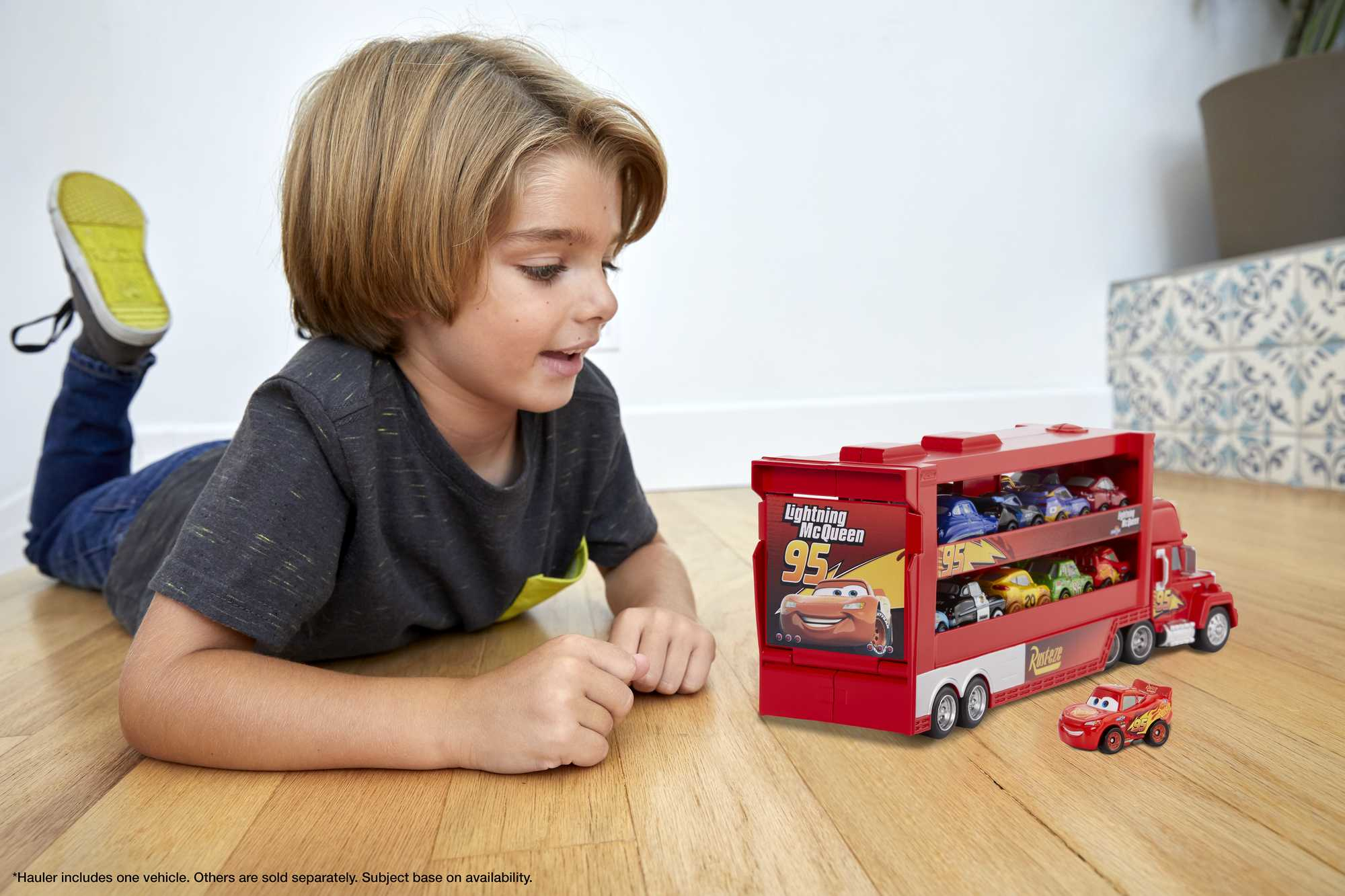 | Plus produit | Transporteurs Disney Pixar Cars à limage des personnages de la saga.\nJouet deux en un : transporteur à faire rouler et Mini Racers à faire monter et descendre du transporteur.\nLassortiment inclut les transporteurs attitrés de Flash McQueen et Jackson Storm (chaque transporteur vendu séparément).\nChaque transporteur Cars possède une rampe daccès pour les mini-bolides en métal. Chaque transporteur peut contenir jusquà 18 Mini Racers ! Inclut un véhicule Mini Racer en métal.\nExcellente idée de cadeau pour les fans de Cars âgés de 3 ans et plus. |