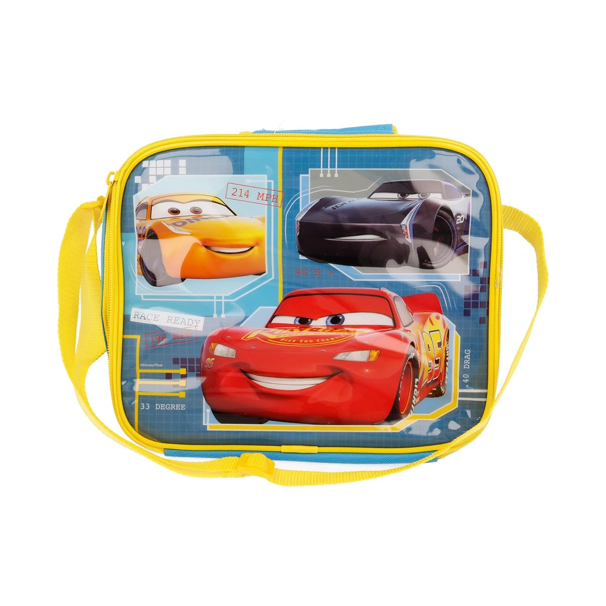 Ce sac isotherme présente un décor sous licence Disney Pixar Cars avec Flash McQueen, Cruz Ramirez et Jackson Storm en façade. La fermeture zippée permet une ouverture complète sur un compartiment principal unique. L'intérieur est doublé d'un revêtement isolant destiné au maintien thermique des aliments. Le sac dispose d'une poignée, d'une bandoulière réglable jaune et d'un porte-étiquette transparent au dos.