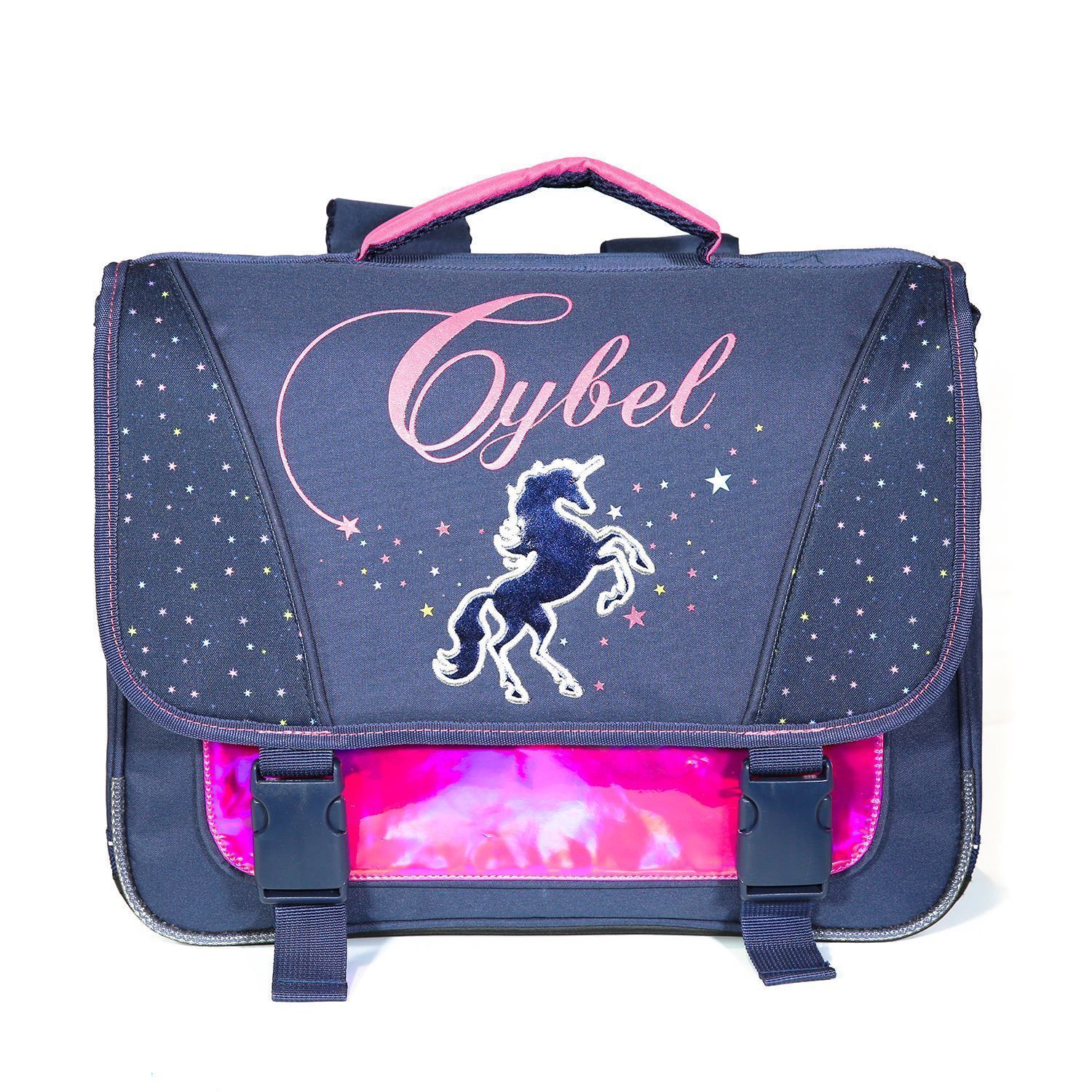Le cartable Cybel 38cm avec sa poche holographique est une valeur sure pour les fans de chevaux et de licornes. Avec son design étoilé, votre fille voyagera sur le dos de sa licorne sur le chemin de l'école ! Ce grand cartable avec ses 2 compartiments et sa poche avant permettra à votre enfant d'y ranger sans problème toutes ses fournitures scolaires. Le tout protégé par un rabat fermé avec deux clips. Ses dimensions de 38cm de long, 14cm de large et 34cm de haut sont adaptées pour les classes de primaire. Coloris bleu marine et rose. 100% polyester. Des bandes réfléchissantes assurent la visibilité de votre enfant sur le chemin de l'école. Nous avons équipé ce cartable d'un dos et de bretelles matelassés ainsi que d'un fond et de coins renforcés. Soyez certain que ce modèle robuste garanti 10 mois ne vous décevra pas.