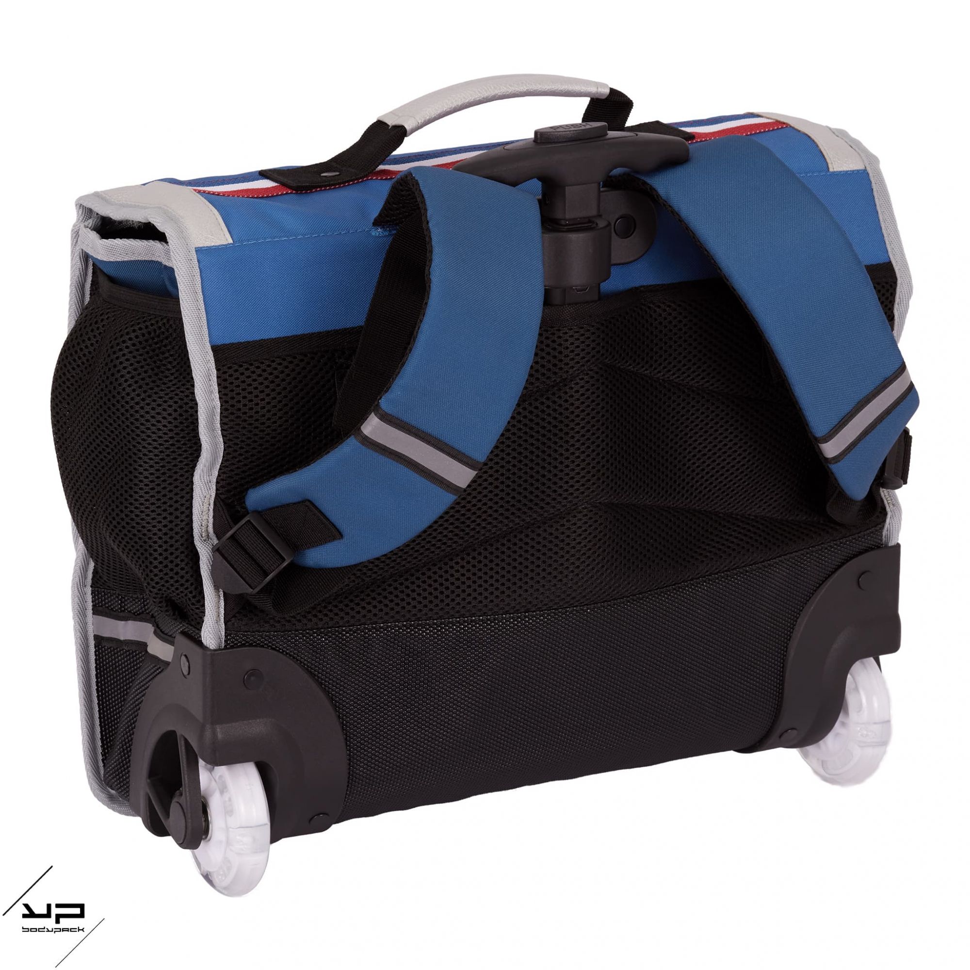Cartable à roulettes modèle Fusée de la marque Bodypack. Ce cartable à 2 compartiments, le dos et les bretelles sont matelassées, fermeture 2 boucles, 2 poches volume, 1 séparation zippée, 1 porte règle. Il y a des parties réfléchissantes pour la sécurité, le fond renforcé pour le confort et une étiquette porte nom pour ne jamais perdre son cartable. Dimensions 35cm (H) 41cm (L) 14cm (P) - Poids : 1.8kg