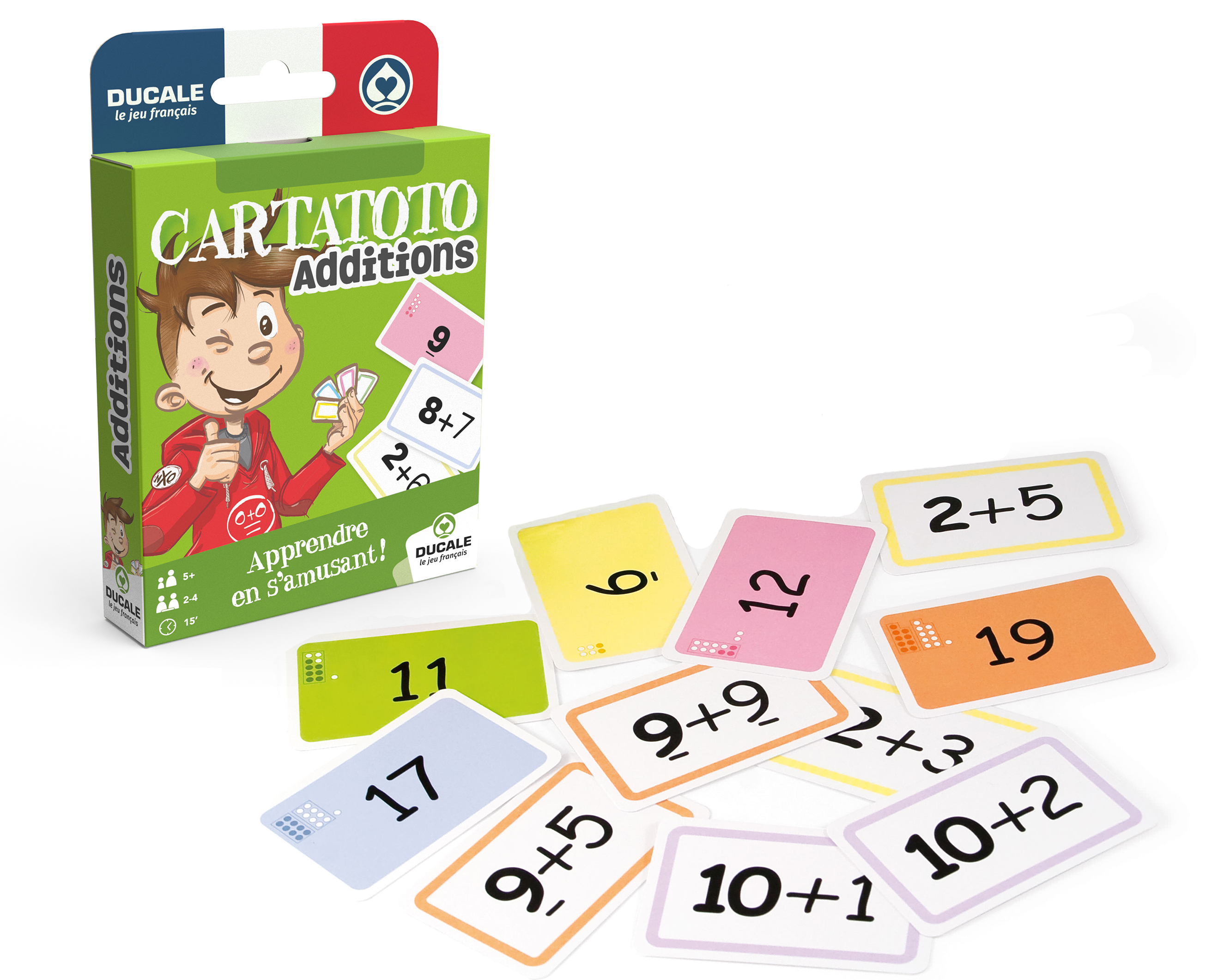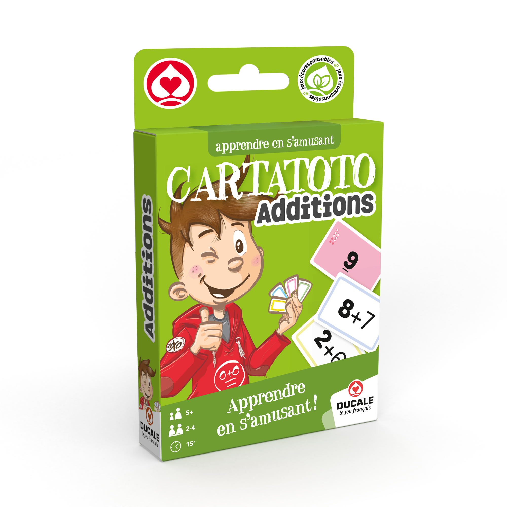 Apprendre et réviser les additions en s'amusant, c'est possible avec le jeu de cartes éducatif Cartatoto ! Les cartes sont recto/verso pour aider l'enfant à compter. On retrouve d'un côté une addition, et au dos son résultat accompagné de symboles colorés pour illustrer le calcul correspondant à celui-ci. Ce procédé permet de jouer à différentes règles de jeux pour un apprentissage ludique par niveaux de difficulté : Batailles, jeu de Mémoire... Un jeu éducatif pour enfant idéal pour faciliter la découverte, l'apprentissage et la révision d'opérations simples, avec des règles faciles. Créé par Fabienne MATHE, Cartatoto est un jeu Médaille d'or au concours Lépine. Dès 5 ans, de 1 à 4 joueurs Contient 110 cartes