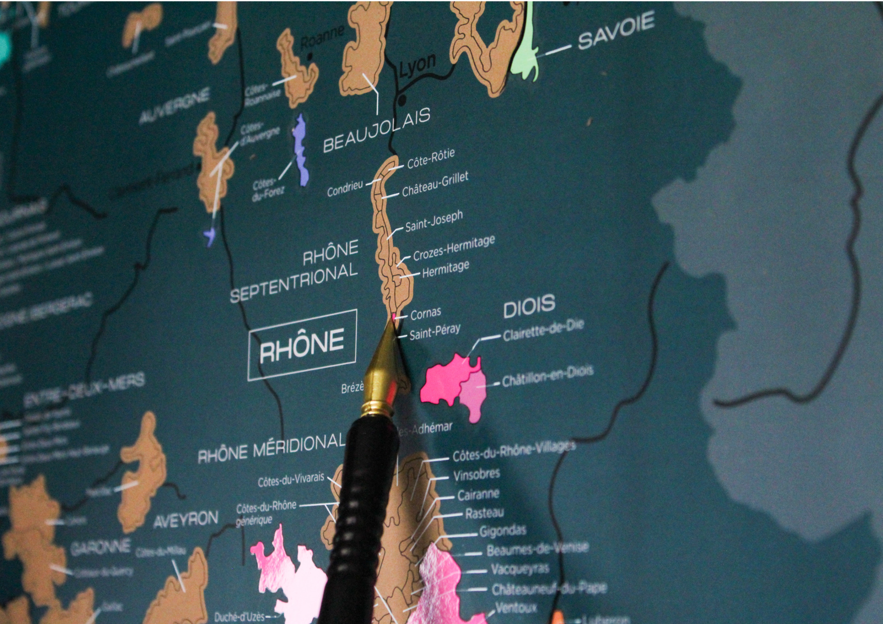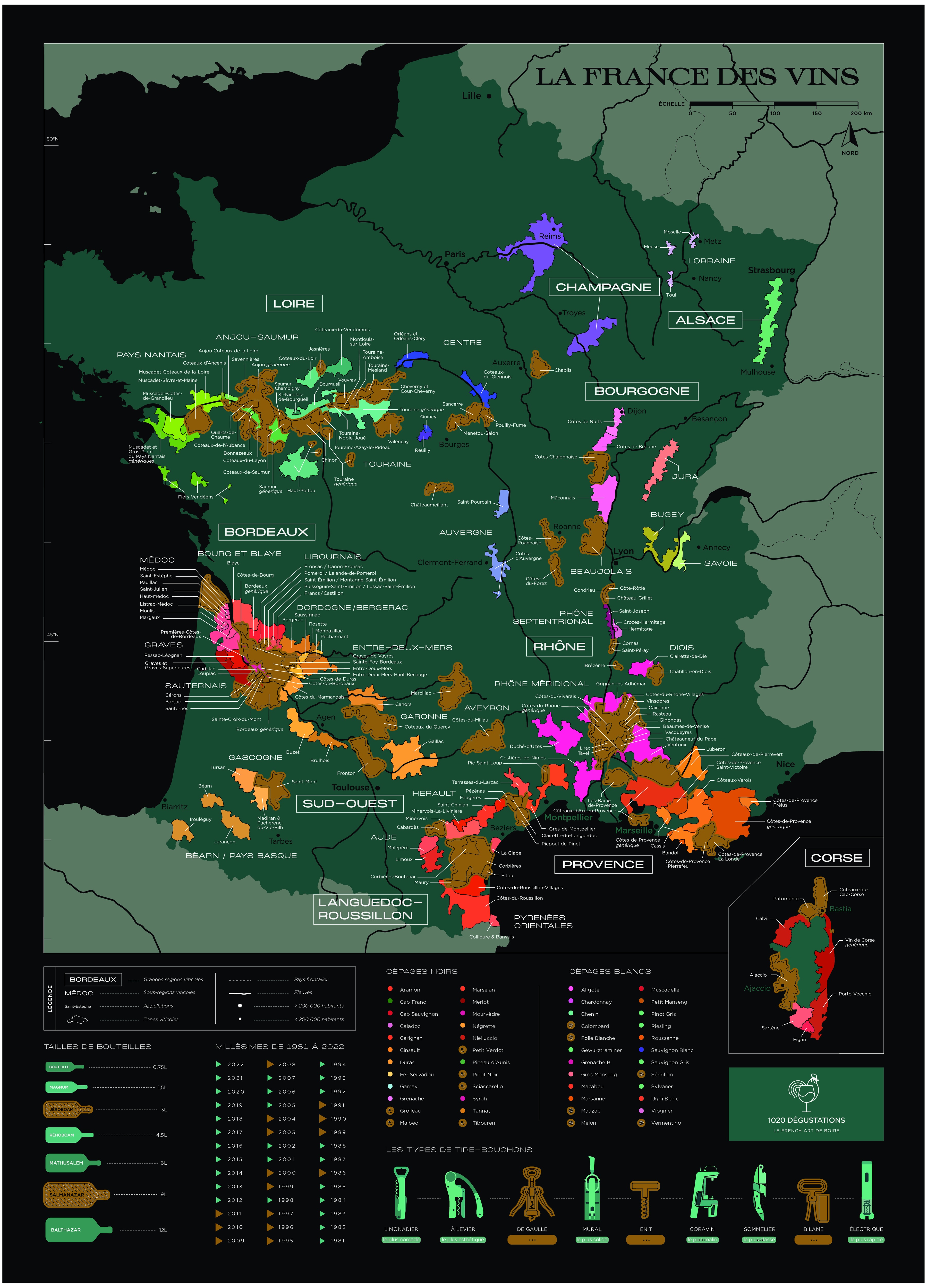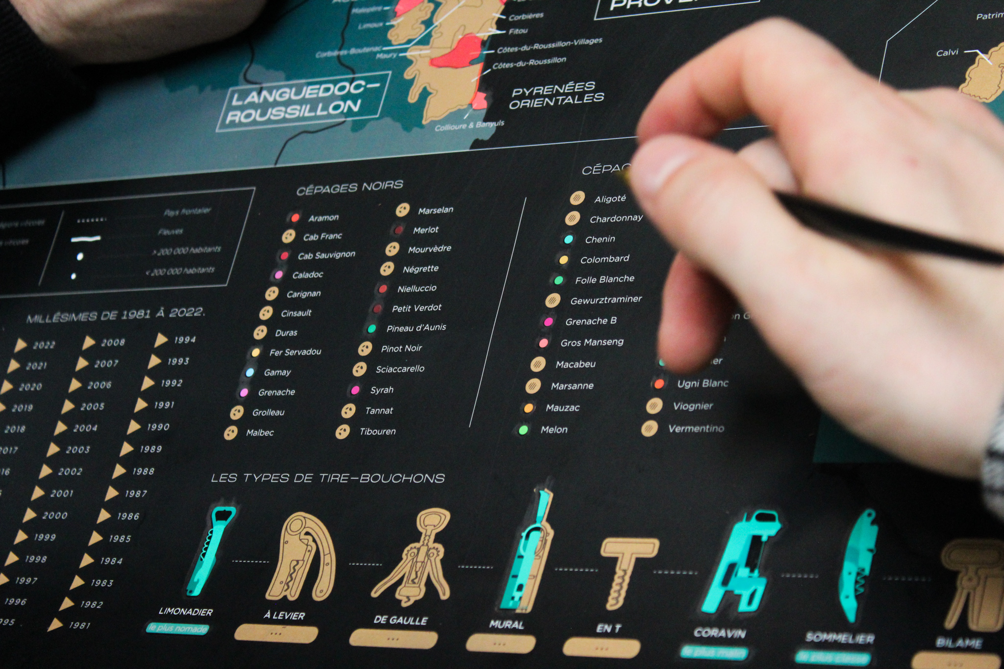 Développez votre culture du vin avec style ! C’est simple, à chaque vin dégusté, grattez l’appellation correspondante mais aussi le cépage, le millésime, le tire-bouchon utilisé ou encore le format de bouteille. L’accessoire idéal pour vous souvenir de vos dégustations et pour que la géographie des appellations viticoles françaises n’ait plus de secret pour vous.