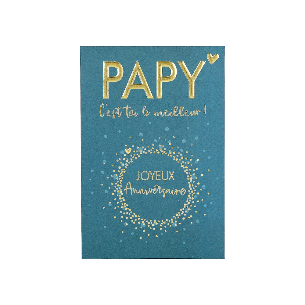 Détails : Carte de voeux et son enveloppe - Texte en relief et doré Dimensions carte : 17.2 x 11.5 cm Thème : Anniversaire Modèle : Papy C'est Toi Le Meilleur !