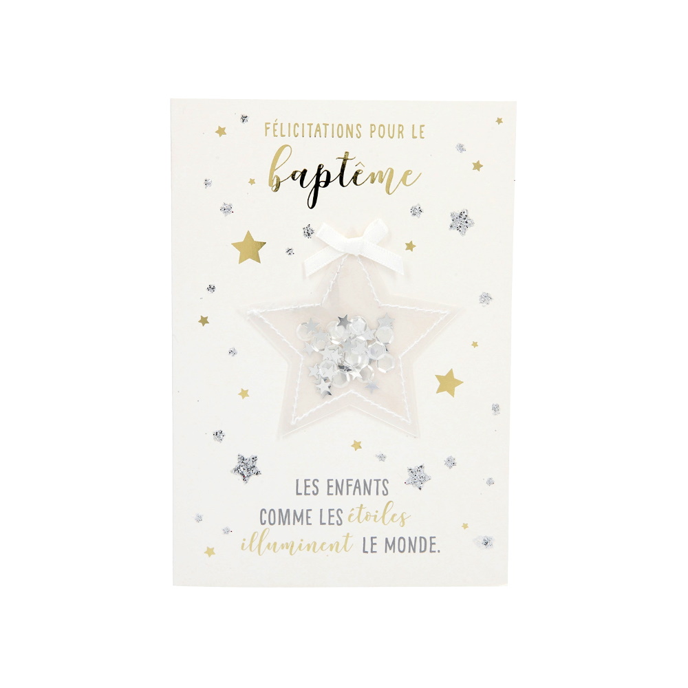Détails : Carte paillettes décorations en relief, mélange de matières - Enveloppe Dimensions carte : 16.5 x 11.5 cm Thème : Baptême Modèle : Félicitations Pour Le Baptême Les Enfants Comme Les Etoiles Illuminent Le Monde
