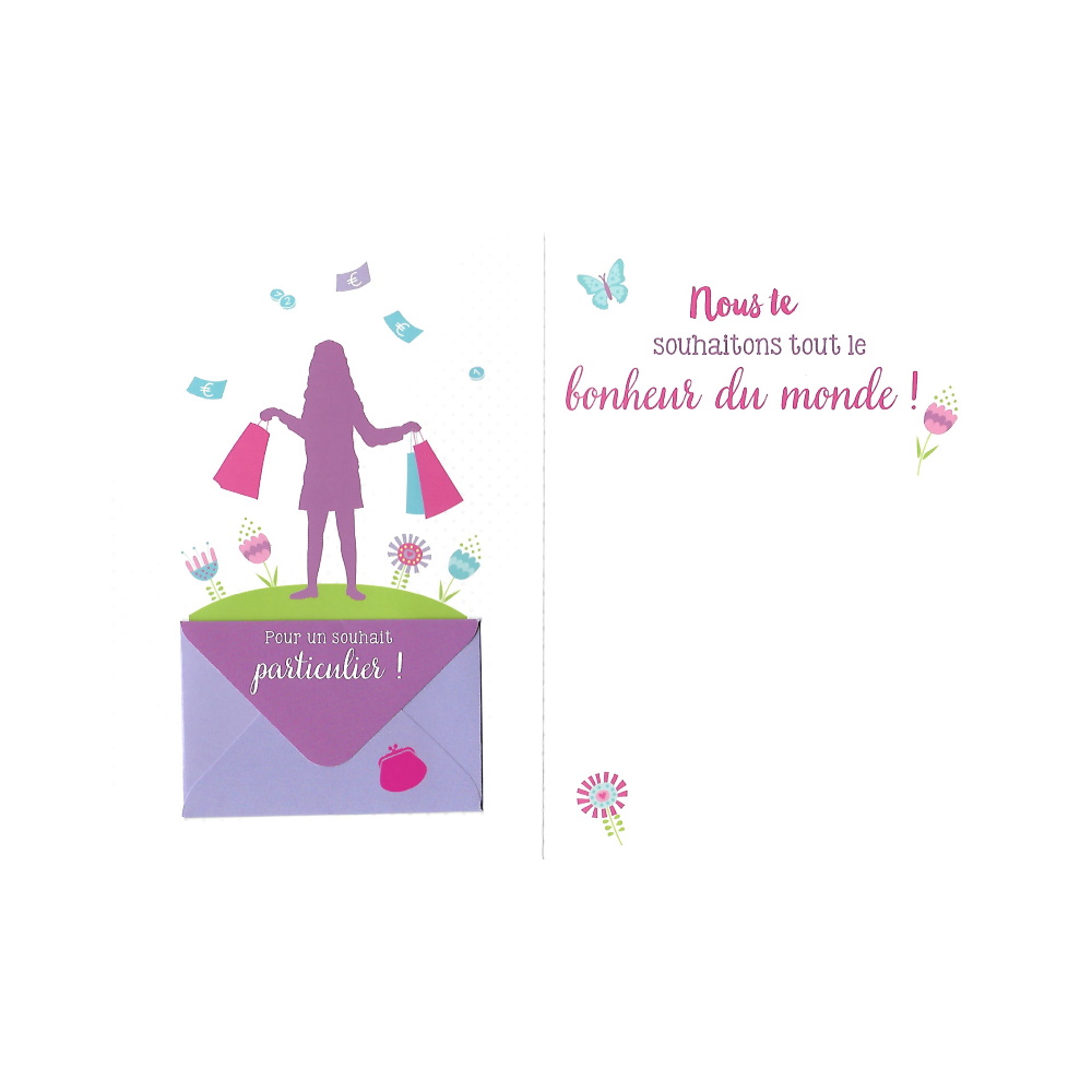 Détails : Carte anniversaire et son enveloppe - A l'intérieur de la carte une petite enveloppe pour y placer un billet Dimensions carte : 11.5 x 16.5 cm Thème : Anniversaire Modèle : Shopping