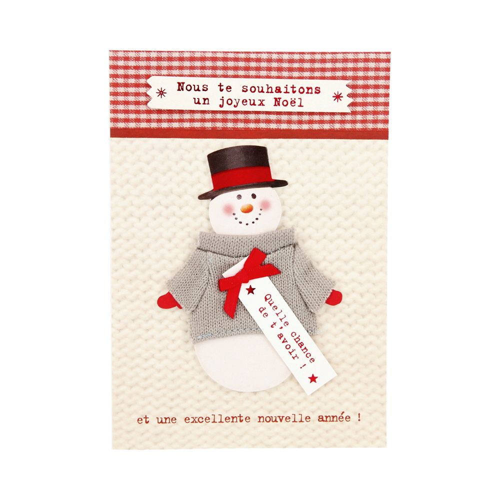 Détails : Carte De V&oelig ux et son enveloppe - Décoration en relief mélange de matières Dimensions carte : 11.5 x 16.5 cm Thème : Fêtes de Fin D'année Modèle : Joyeux Noël Bonne Année Bonhomme de Neige