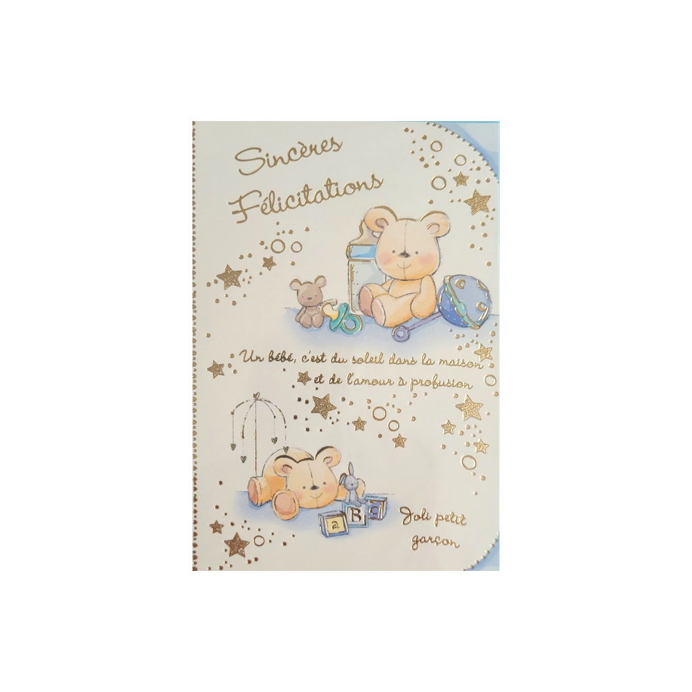 Détails : Carte de voeux et son enveloppe Dimensions carte : 16.5 x 11.5 cm Thème : Naissance Modèle : Sincères Félicitations - Joli Petit Garçon