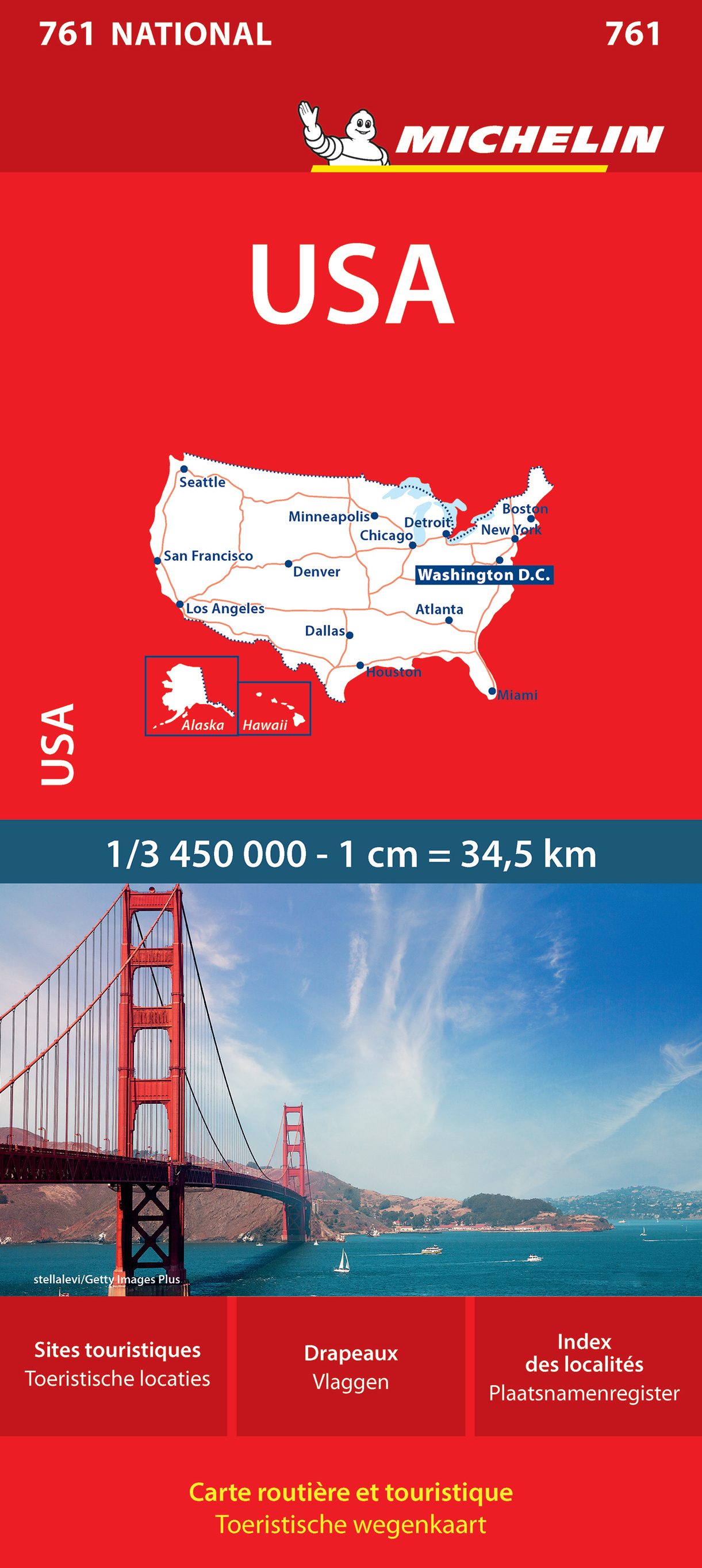 Carte routière et touristique Michelin : pour être bien guidé et vraiment libre !Mise à jour chaque année la carte USA au 1/3 450 000 (1cm = 34,5km) vous apporte une vue d'ensemble. Retrouvez l'index des localités, la liste des drapeaux et la localisation des sites touristiques.