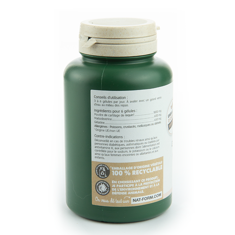 Ingrédients pour 6 gélules : Poudre de cartilage de requin 1800 mg Maltodextrine 600 mg Gélatine 450 mg