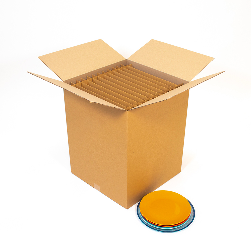 Carton déménagement pour ranger et stocker 18 assiettes plates ou creuses en toute sérénité. Ce produit est composé de : - 1 carton de dimensions de 34x34x56cm. - 2 croisillons de 9 emplacements chacun - 1 plaque intercalaire Peut accueillir des assiettes de 4 centimètres d'épaisseur et de 28-29 centimètres de diamètre. Produit livré plié en deux et cerclé.