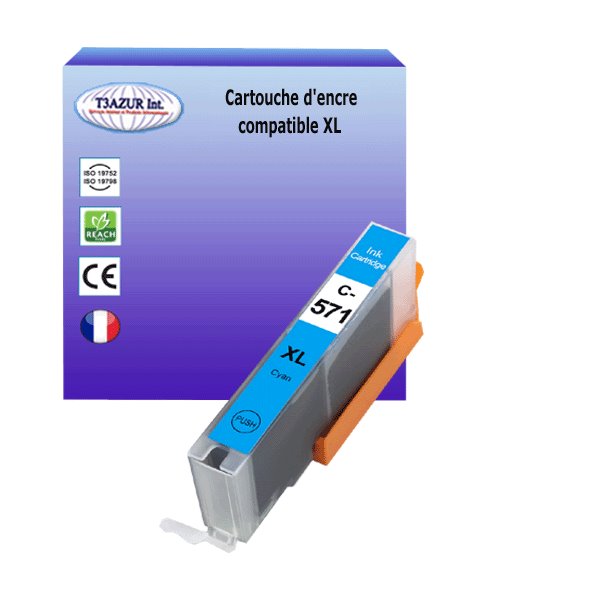 Remplacent les cartouches d'encre Canon CLI571 XL Cyan - Volume: 11 ml avec un rendement de 5% , repondent à toutes les normes européennes ISO 9001/14001, STMC, CE, ROHS - 100% Compatible - Encre de haute qualité qui garantie une excellence qualité d'impression - Marque T3AZUR