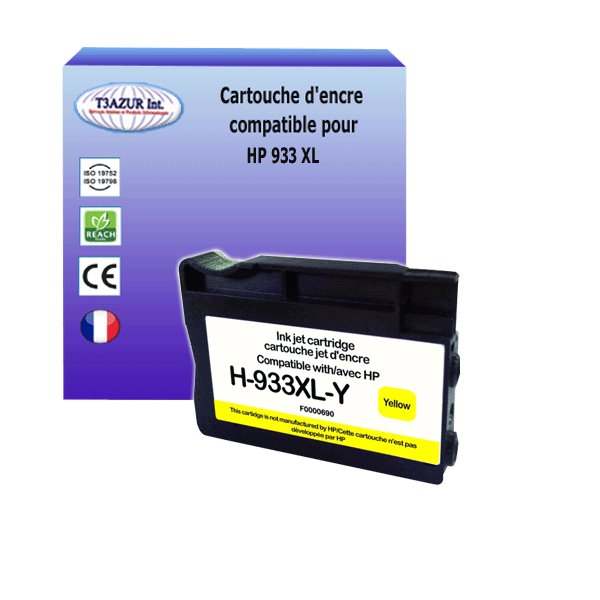 Remplacent les HP 933XL (CN056AE) - Jaune - Volume: 14ml (Haute Capacité) avec un rendement de 5% , repondent à toutes les normes européennes ISO 9001/14001, STMC, CE, ROHS - Marque T3AZUR