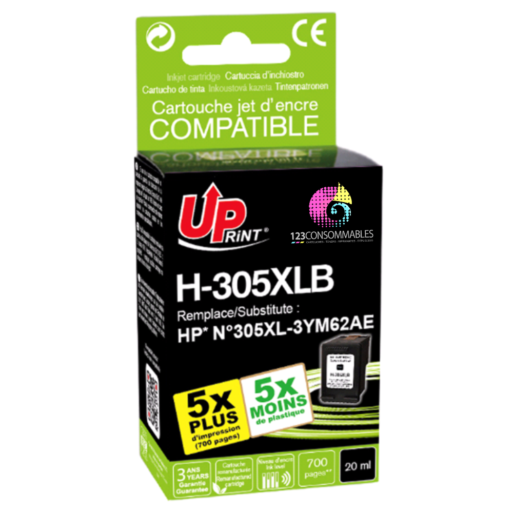 5 fois plus d'impressions qu'avec une cartouches HP 305. Avec puce, reconnaissance du niveau d’encre Capacité plus importante que la cartouche d'origine : 700 pages contre 240 pages pour la cartouche de marque HP Avec cette cartouche, vous réalisez des économies importantes et préservez l'impact sur l'écologie : 5 fois moins de plastique Garantie UPrint de 3 ans