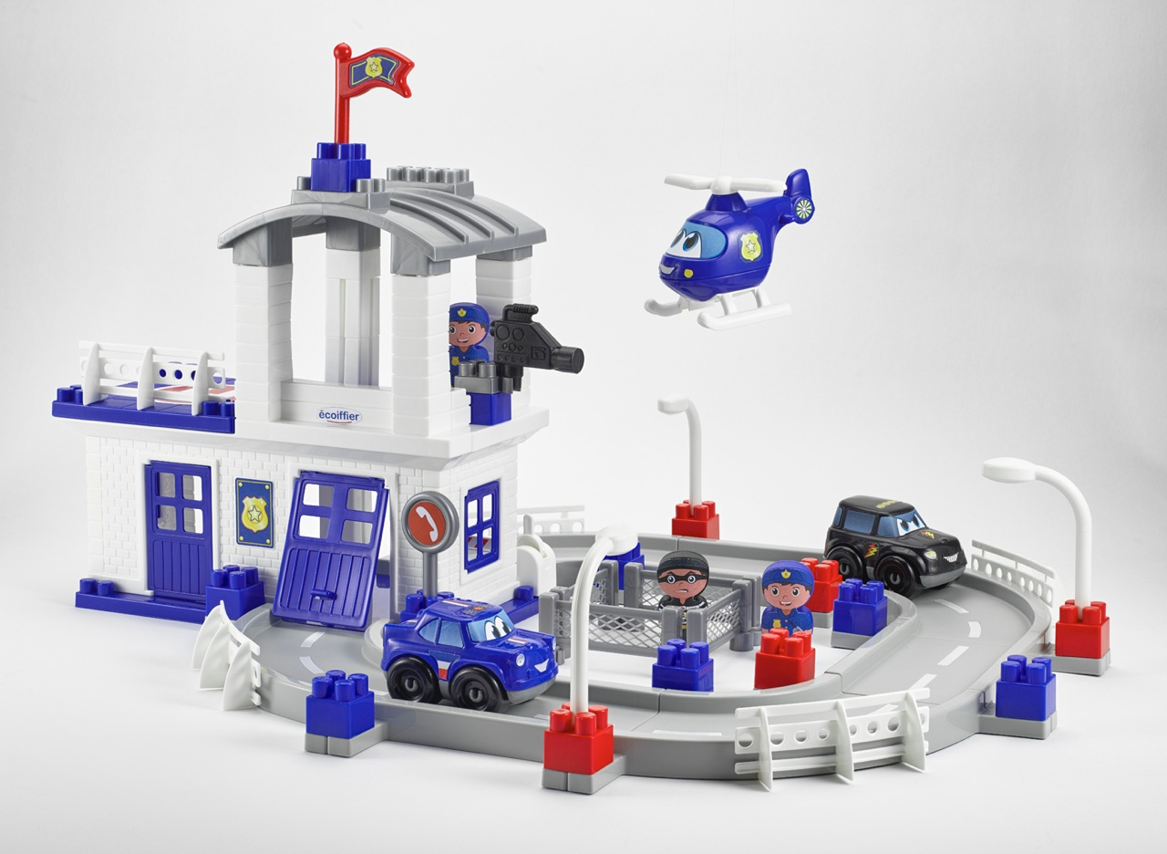Une caserne de police à construire avec une piste, une voiture de police, une voiture de voleur, un hélicoptère, 2 policiers et un voleur. Conseillé dès 18 mois. Origine France Garantie.
