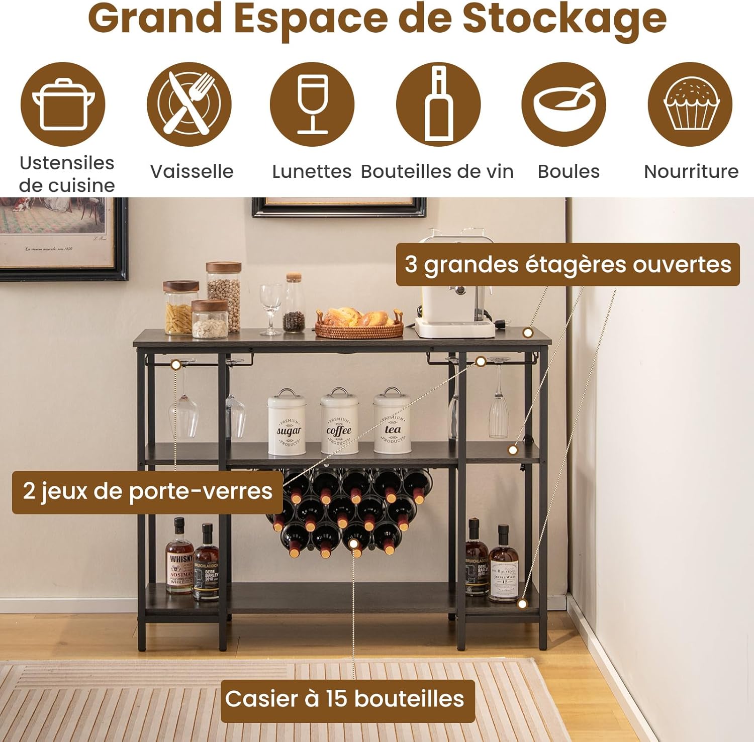 - Grand espace de rangement : Cette table console présente un design ouvert avec 3 grandes étagères ouvertes, 2 ensembles de porte-verres et 15 casiers à bouteilles. Elle offre beaucoup d'espace pour ranger une variété d'articles essentiels tels que des verres, des bouteilles de vin, des boissons, des ustensiles de cuisine, de la vaisselle, des bols, de la nourriture et bien plus encore.