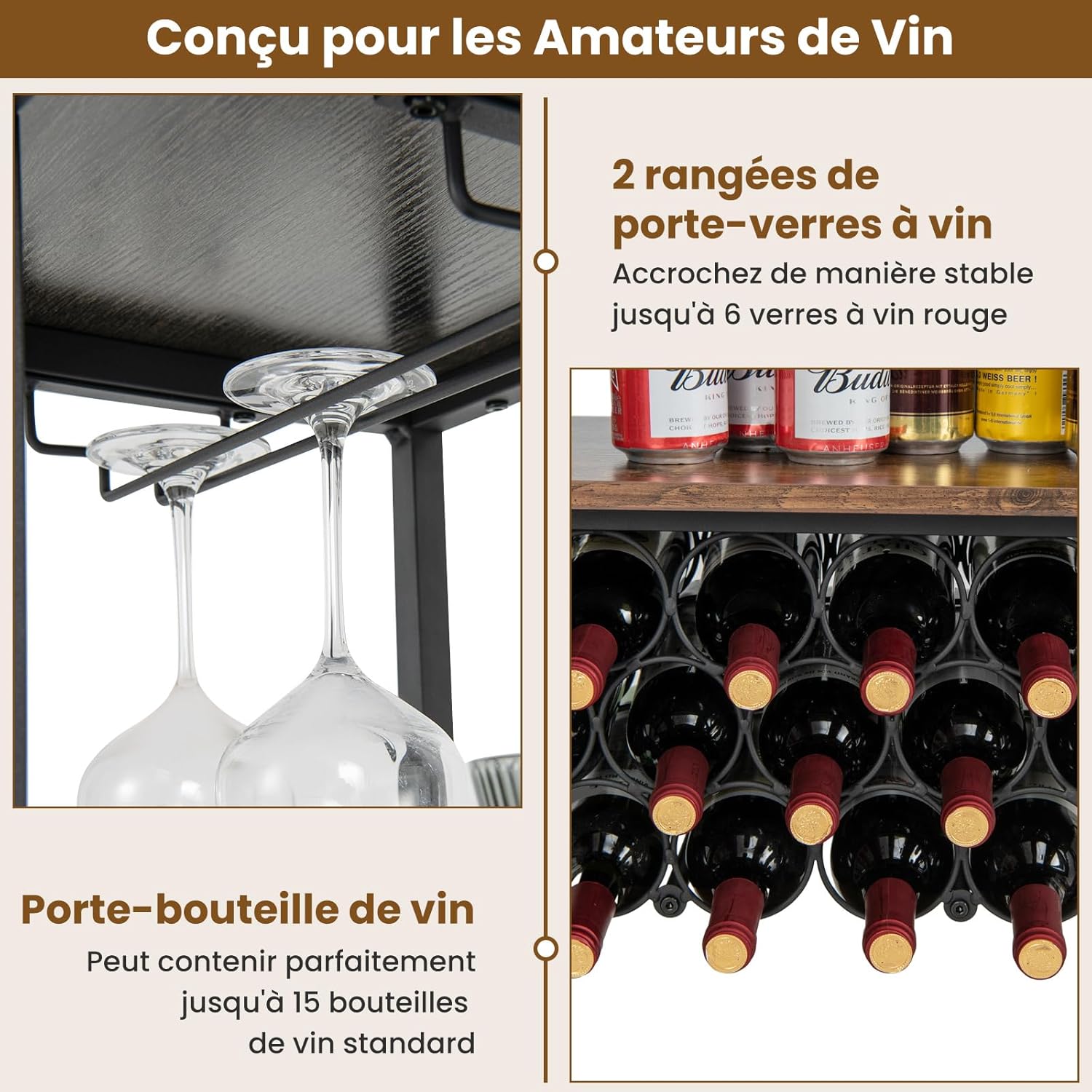 - Conçue pour les amateurs de vin : Notre casier à vin vintage est une excellente option pour stocker et exposer votre collection de vins. Les 2 rangées de porte-verres à vin peuvent suspendre de manière stable jusqu'à 6 verres à vin. Et le porte-bouteille peut contenir jusqu'à 15 bouteilles de vin standard. Vous pourrez donc profiter de boire en famille ou entre amis.