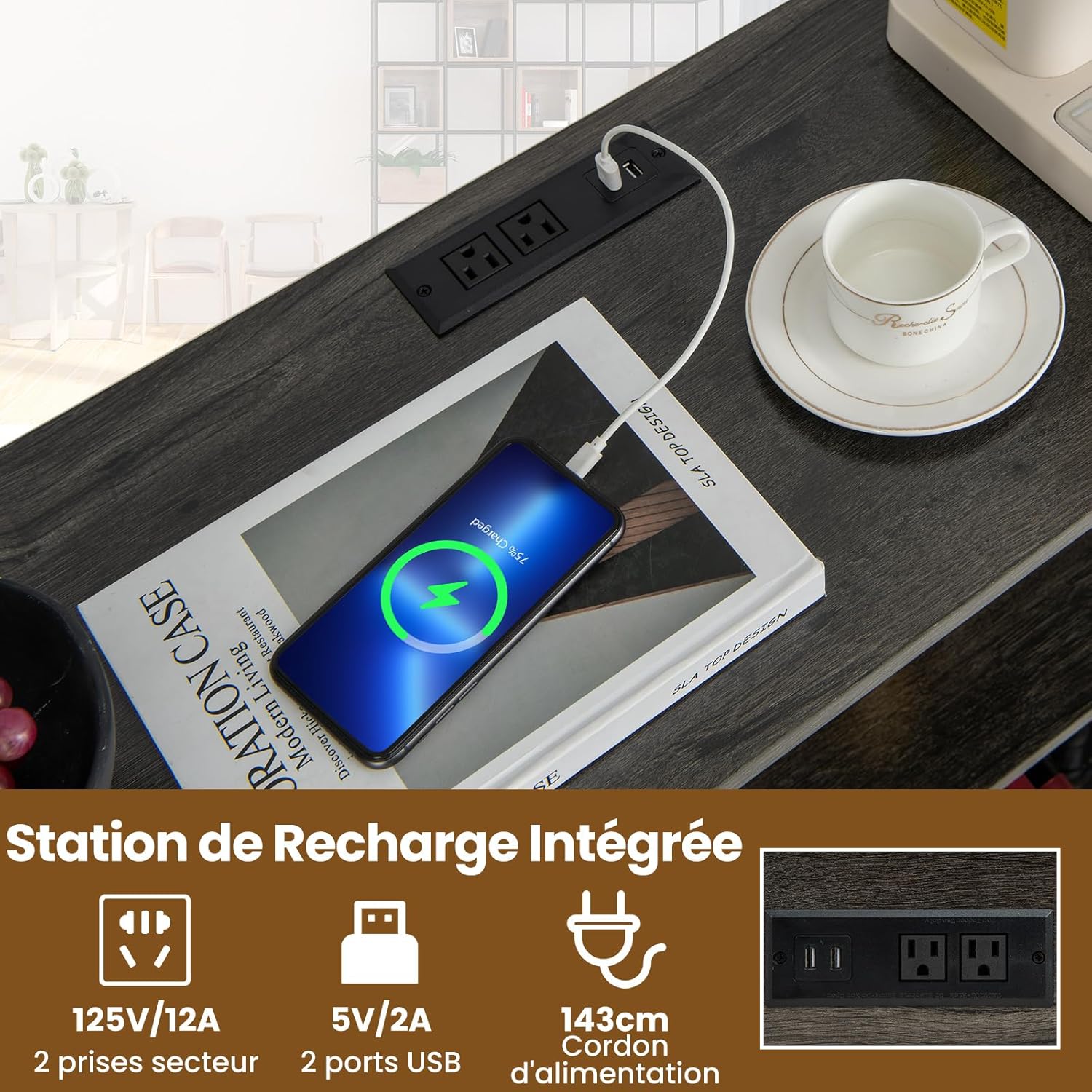 - Station de recharge pratique : Le bar à vin est équipé d'une station de recharge, qui peut fournir une alimentation continue à vos petits appareils de cuisine pendant que vous cuisinez ou buvez. Plus précisément, il y a 2 prises secteur (125 V/ 12 A) et 2 ports USB (5 V/ 2 A) pour un chargement pratique.