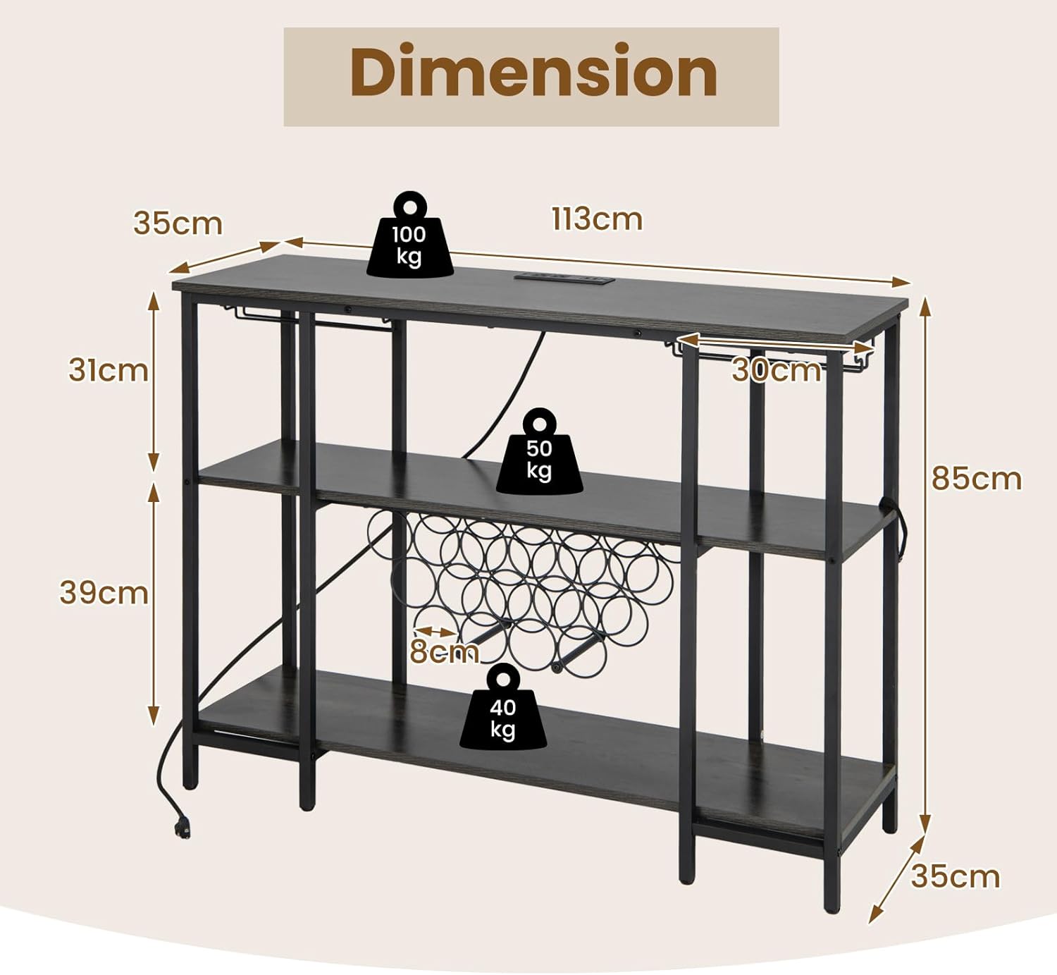 Ce meuble est doté de 2 rangées de porte-verres, d'un casier pour 15 bouteilles et de 3 étagères, offrant une grande capacité pour organiser les essentiels de la cuisine et exposer votre collection de vins. Il dispose de 2 prises intégrées et de 2 ports USB pour alimenter divers appareils de cuisine. Il peut servir de meuble TV, de console, de meuble bar ou de buffet pour répondre à vos différents besoins. Son style industriel s'harmonise avec différents styles de décoration intérieure.