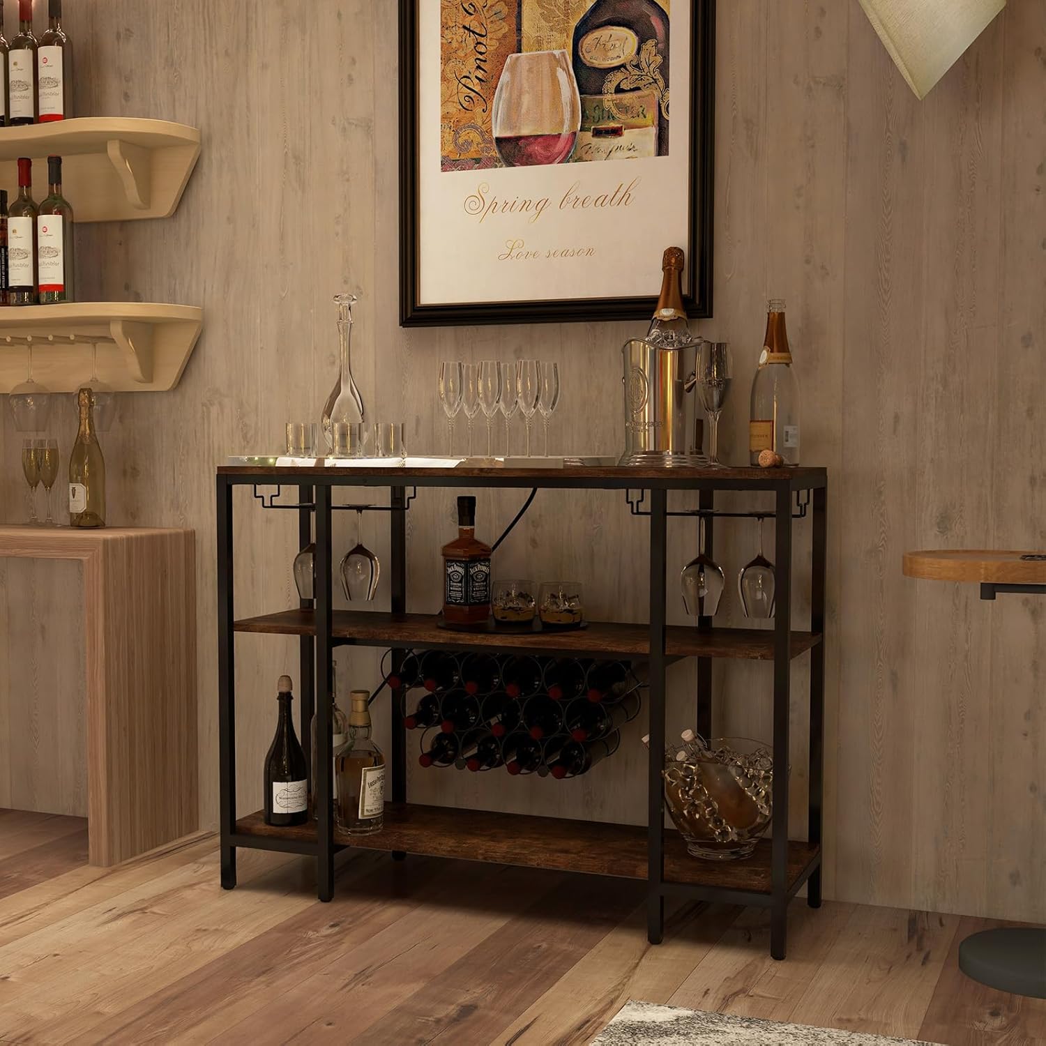 - Grand espace de rangement : Cette table console présente un design ouvert avec 3 grandes étagères ouvertes, 2 ensembles de porte-verres qui peuvent peuvent contenir 5 à 6 verres. et 15 casiers à bouteilles. Elle offre beaucoup d'espace pour ranger une variété d'articles essentiels tels que des verres, des bouteilles de vin, des boissons, des ustensiles de cuisine, de la vaisselle, des bols, de la nourriture et bien plus encore.