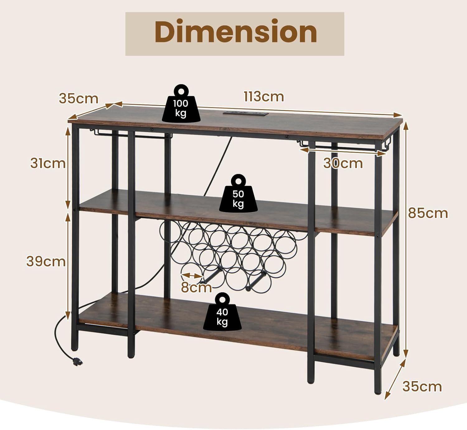 Ce meuble est doté de 2 rangées de porte-verres, d'un casier pour 15 bouteilles et de 3 étagères, offrant une grande capacité pour organiser les essentiels de la cuisine et exposer votre collection de vins. Il dispose de 2 prises intégrées et de 2 ports USB pour alimenter divers appareils de cuisine. Il peut servir de meuble TV, de console, de meuble bar ou de buffet pour répondre à vos différents besoins. Son style industriel s'harmonise avec différents styles de décoration intérieure.