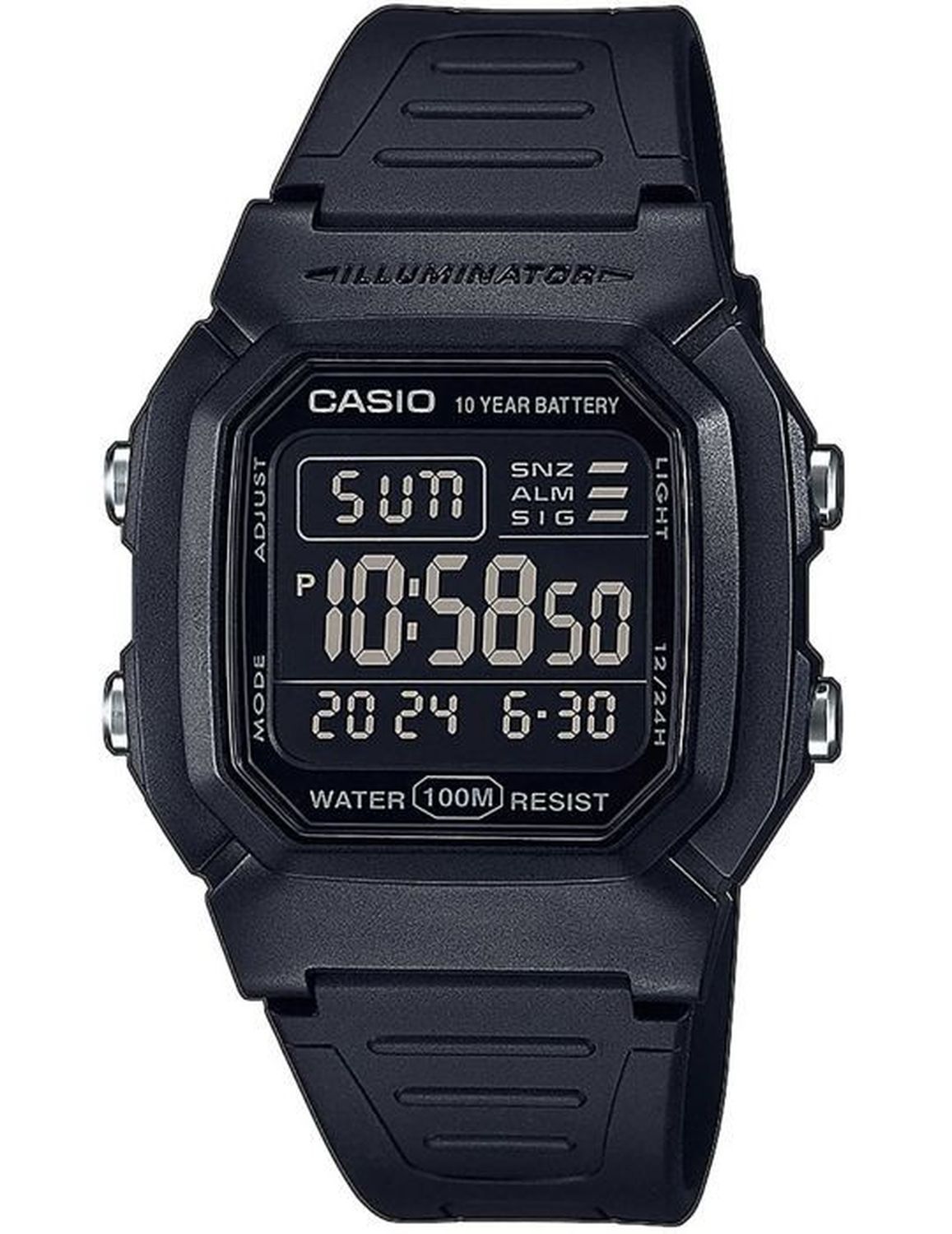 Éclairage LED Deuxieme fuseau horaire Chronometre 1/100 s - 24 heures Alarme multiple, bip horaire Fonction Snooze Calendrier automatique Format de l'heure 12/24 heures Verre acrylique Boîtier en résine Bracelet en résine Boucle 10 ans - 1 pile Classe d'étanchéité (10 bars)