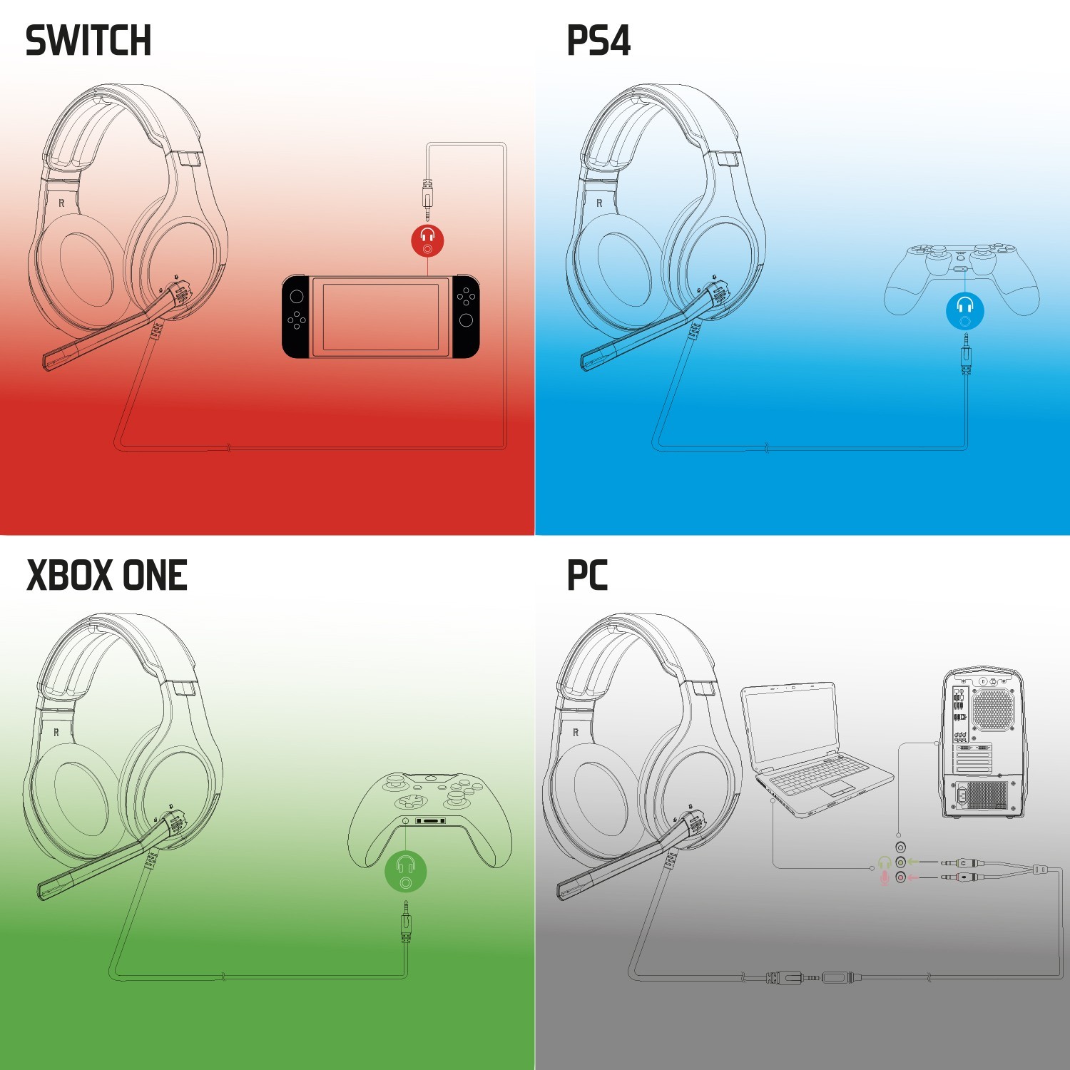 Baissez le micro pour communiquer avec votre Team. Télécommande intégrée dans l'écouteur gauche pour régler facilement le volume sonore. Le câble principal, d'une longueur d'un mettre se branche directement sur votre manette PS4 / PS5, XBOX ONE et XBOX SERIE ou sur votre console Switch. Pour une compatibilité PC, le casque est fourni avec une rallonge double jack 3,5 mm.