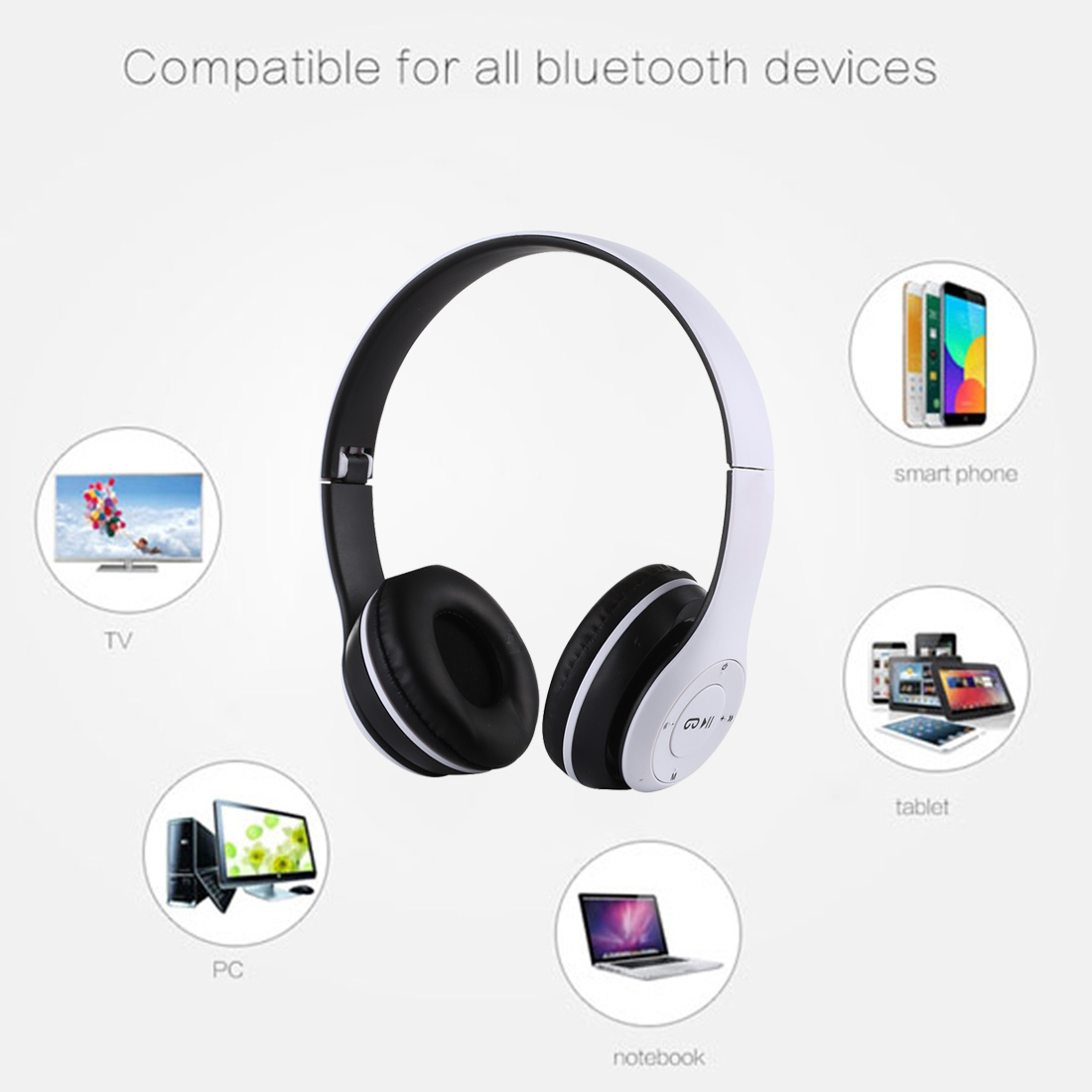 Casque Bluetooth Pliable Sans Fil, Support MP3 FM Appel, Autonomie 18h, Charge 2h Blanc YONIS