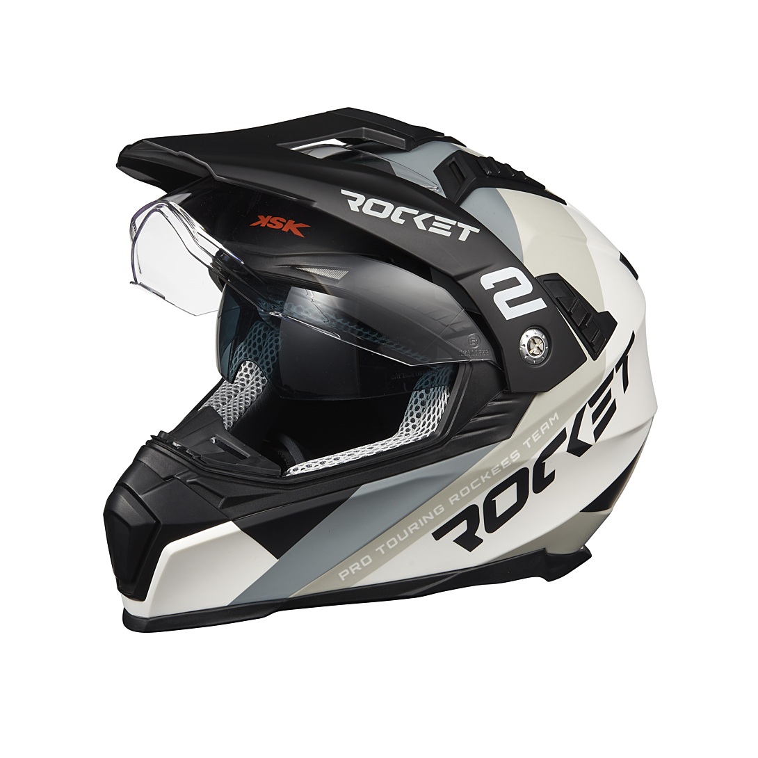 Casque Cross DS ROCKET WHITE, coque en ABS ergonomique, équipé d'une visière transparente traitée anti-rayures, d’une visière solaire et d’une boucle micrométrique, système de ventilations supérieures et inférieures ajustables, extracteur d’air, intérieur entièrement démontable et lavable. Le DS Rocket répond à toutes les normes françaises et européennes en vigueur (ECE R 22.06). Livré avec housse de protection.