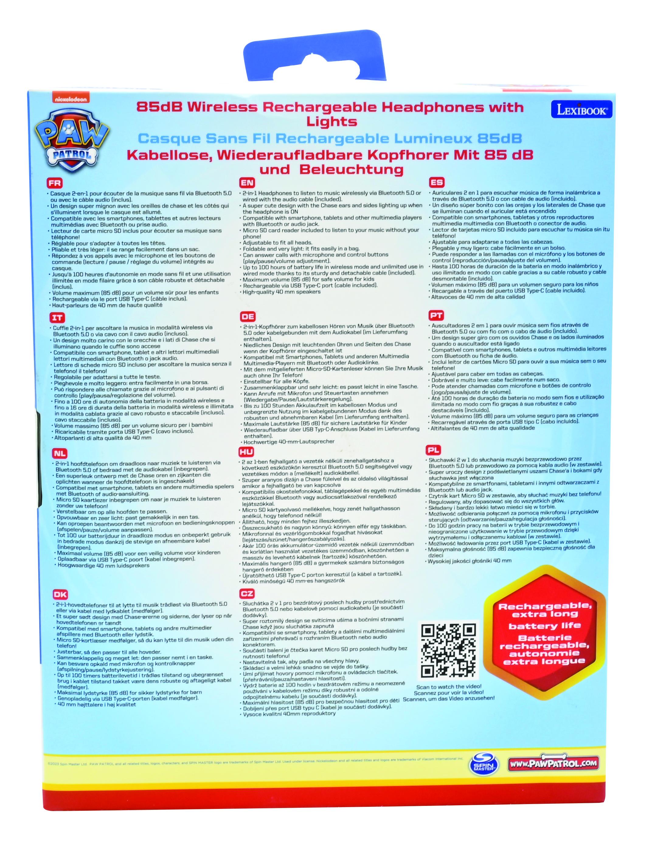 | Libellé | Casque lumineux pliable Bluetooth et filaire Chase de La Pat' Patroulle avec limitation du volume |