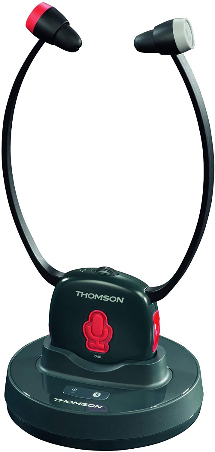 Thomson Casque sans fil WHP6309BT ""Senior 4in1"" (In-Ear, pour TV/HIFI, pour les seniors, contrôle du volume séparé, station de charge, protège-menton, numérique) Noir/Rouge Poids : 153 g A2DP : Oui Autonomie max. en communication : 8 h Autonomie max. en veille : 250 h Contrôle du Volume : Oui Emplacement du microphone : Microphone intégré Modèle : Stéréo Profils bluetooth compatibles : A2DP, AVRCP, HSP Sonita Stable phase technology (SPT) : Non Structure : Ecouteurs intra-auriculaires (In-Ear) Touche de prise d'appel : Oui Connexion : Bluetooth, Cable Bande de fréquences : 2402-2480MHz Distance de transmission : 10 m"