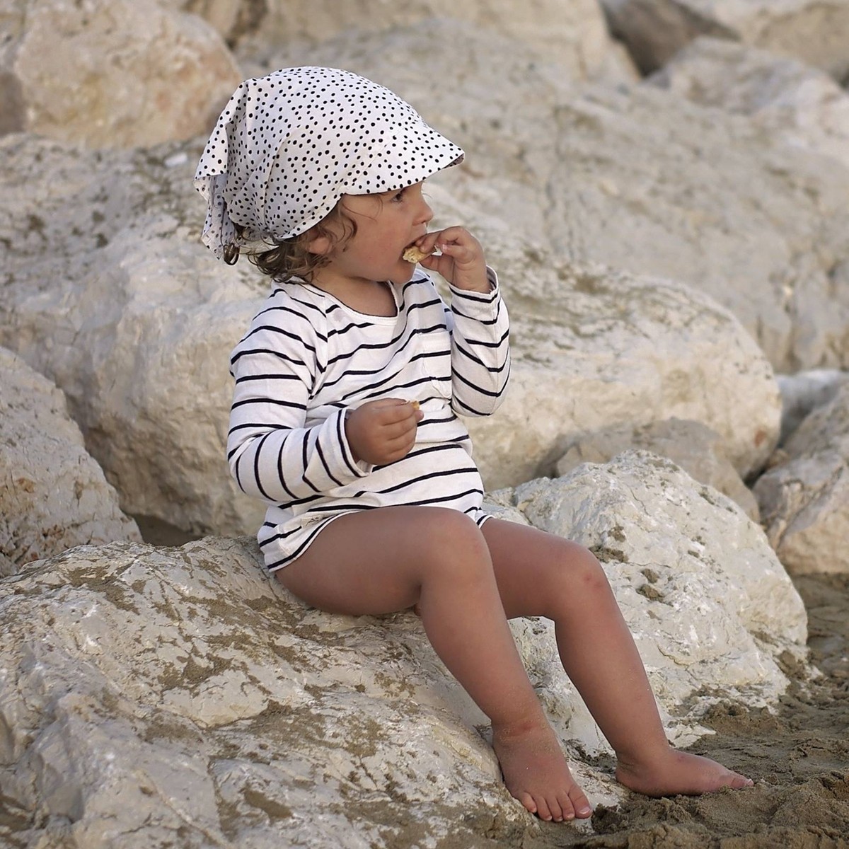 Le bandana Flora se positionne très simplement, il suffit de le nouer à l'arrière de la tête de votre enfant et de placer la visière comme vous le souhaitez, sortie ou rentrée pour afficher un style chic ou décontracté.