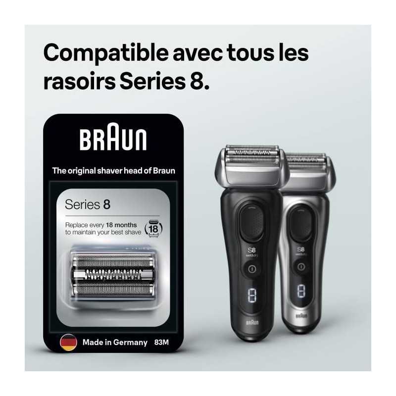 8-83m - cassette pour rasoir séries 8 - Cassette 8-83M braun pour rasoir séries 8. Pour conserver le meilleur rasage, nous vous recommandons de remplacer la tête de rasage tous les 18 mois.