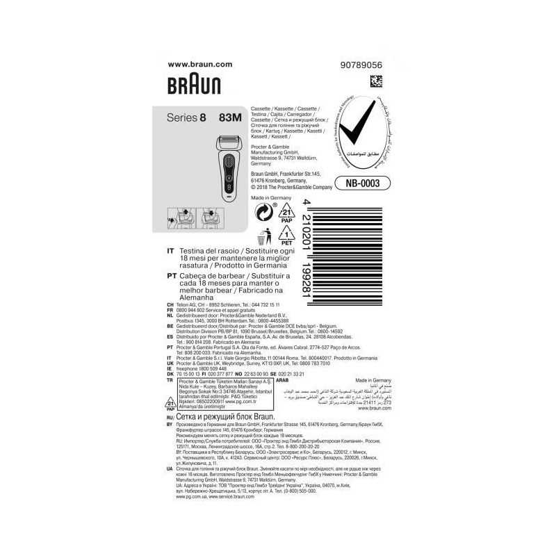 Autre(s) information(s) Fabriqué en Allemagne; emballage: blister; texte avant: Replace every 18 months to maintain your best shave; langues sur emballage: français et anglais (et autres langues visibles au dos).