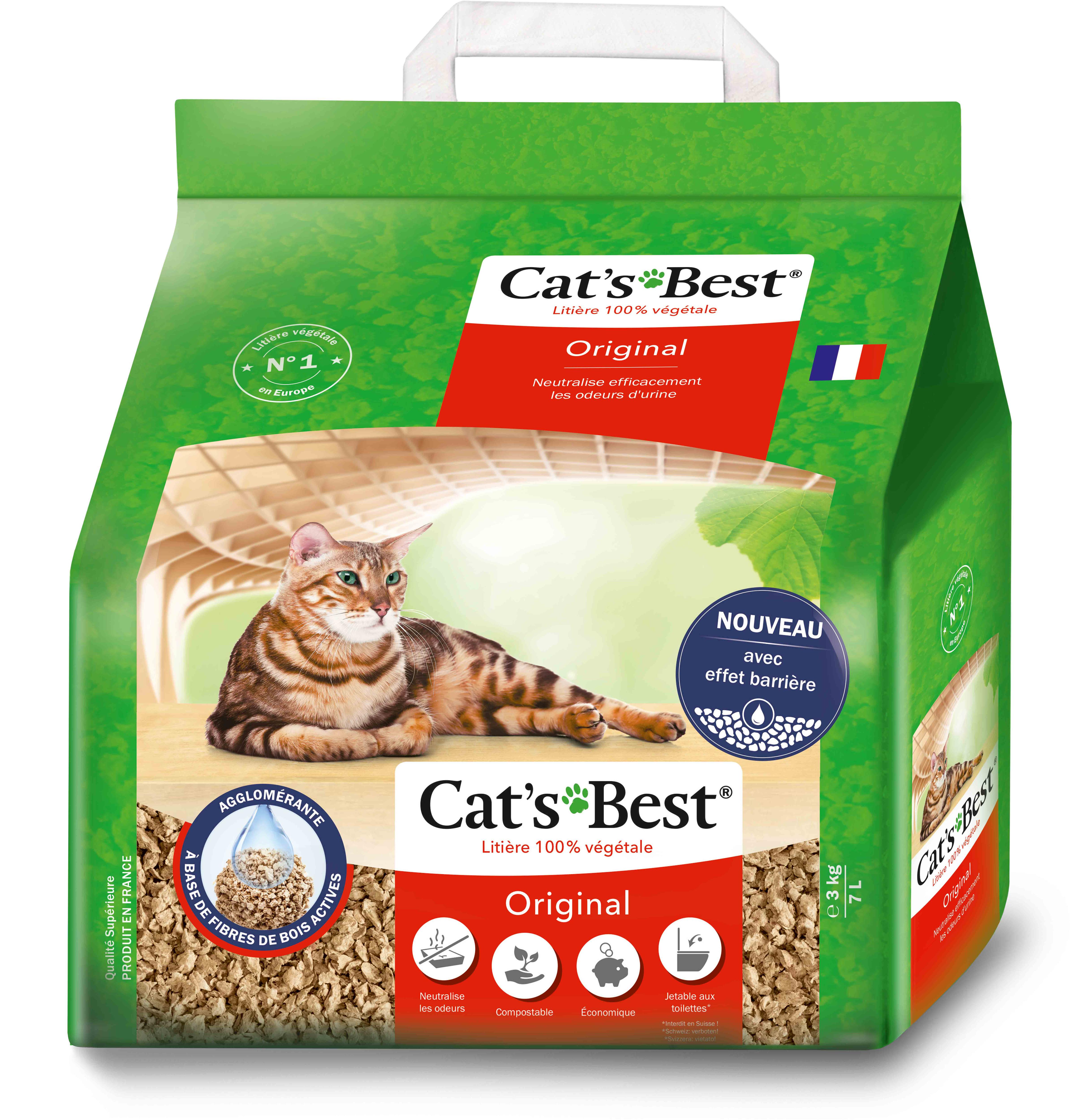 Litière végétale agglomérante à base de bois, Cat's Best Original capture odeurs et humidité, grâce à sa technologie de fibres de bois actives qui lui confère un taux d'absorption de 700 % ! Cat’s Best Original est sans additifs chimiques, compostable, jetable aux toilettes par petites quantités. Respecter les dispositions locales applicables.