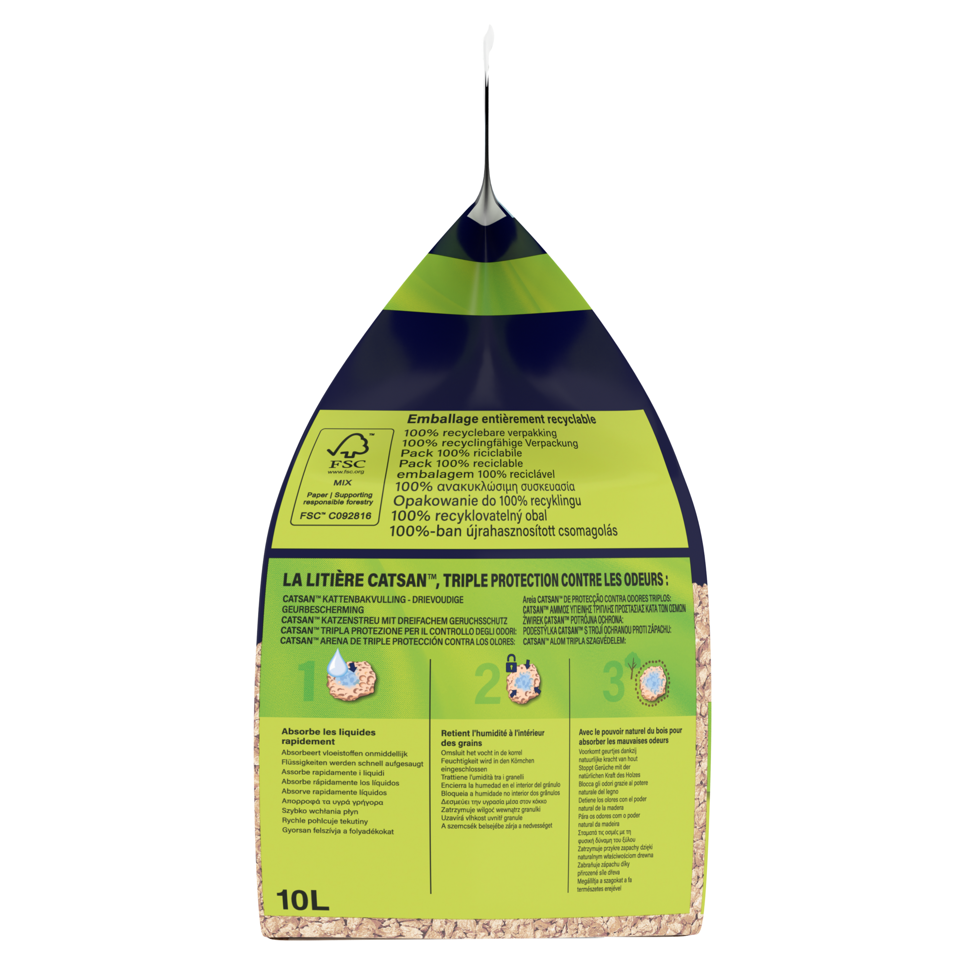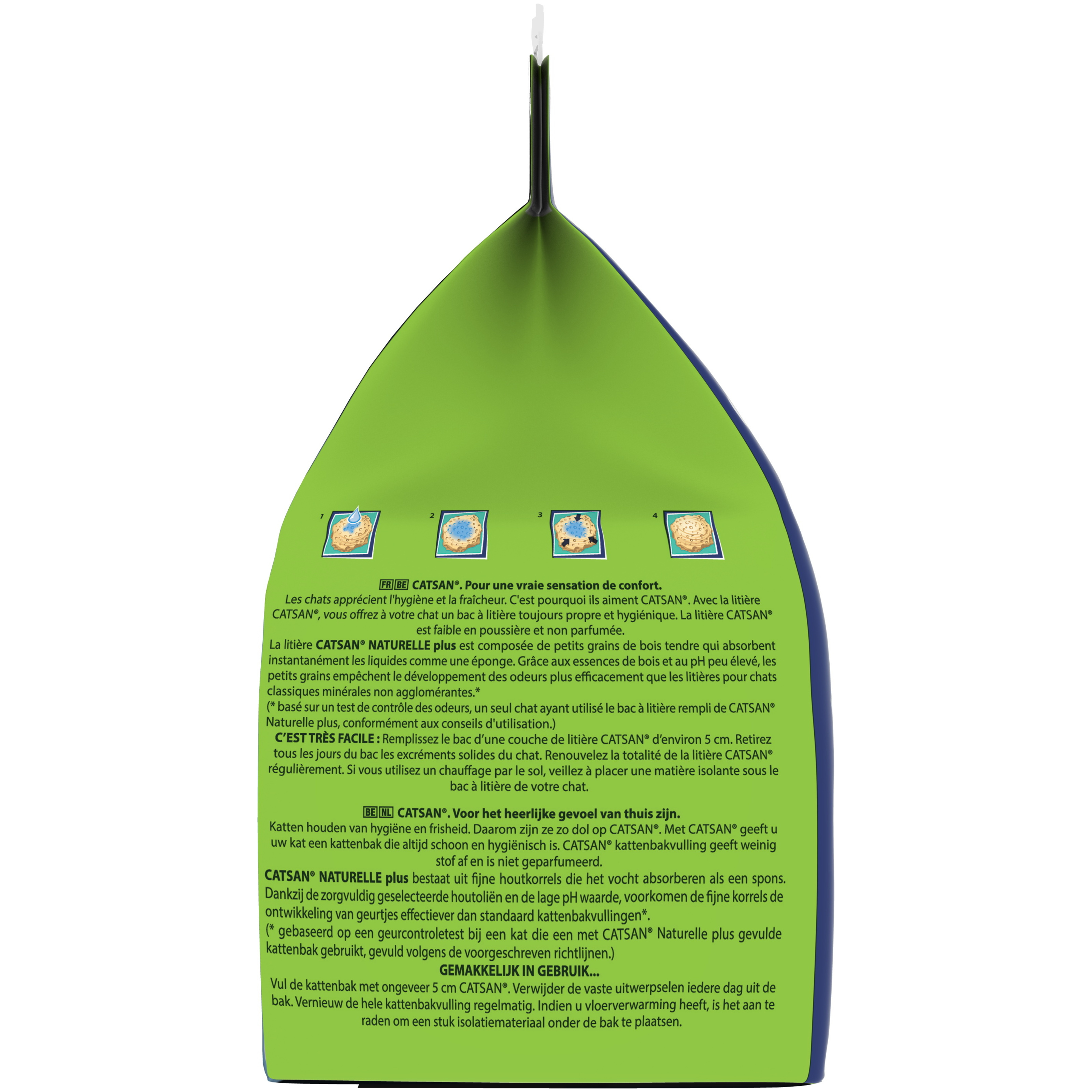 Litière pour chats végétale 100% compostable. La litière Catsan™ Naturelle Plus est composée de petits grains de bois tendre qui absorbent instantanément les liquides comme une éponge. Grâce aux essences de bois et au pH peu élevé, les petits grains de bois empêchent très efficacement le développement des odeurs. La litière Catsan™ est faible en poussière et non parfumée. Fabriqué en France. 3x plus absorbante qu'une litière classique minérale non agglomérante* (*basé sur un test de contrôle des odeurs, un seul chat ayant utilisé le bac à litière rempli de Catsan® Naturelle Plus, conformément aux conseils d'utilisation.)