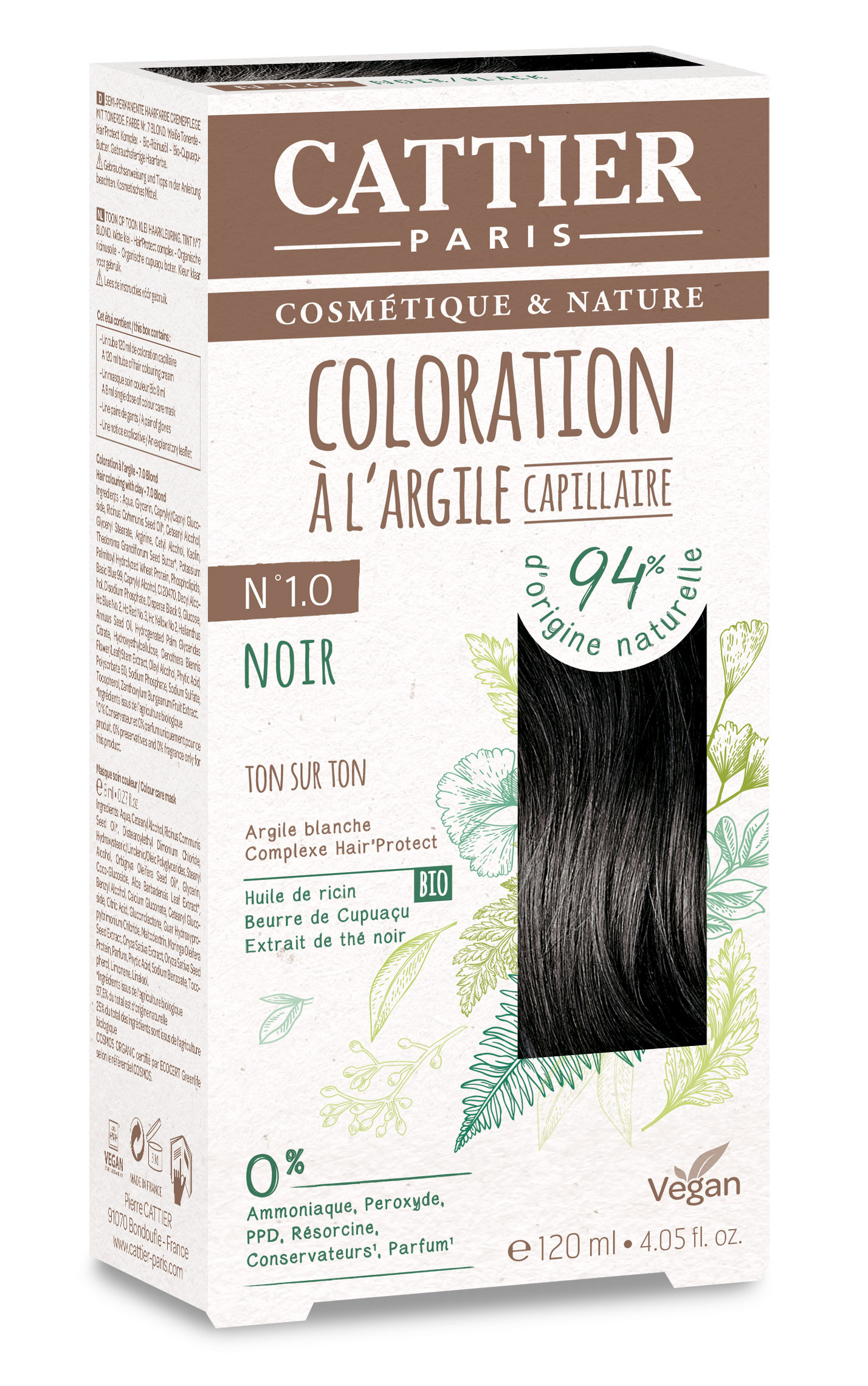 La coloration à l’argile Cattier colore les cheveux un à un pour des reflets intenses, une couleur lumineuse, naturelle et une couvrance à 100% des premiers cheveux blancs. Sa formule douce, composée d’argile blanche et d’ingrédients naturels et bio couvre le cheveu blanc en se déposant à la surface du cheveu puis s'estompe au fil des shampooings pour une tenue allant de 4 à 6 semaines. Les nuances se fondent harmonieusement avec la couleur de vos cheveux pour un résultat naturel et lumineux.