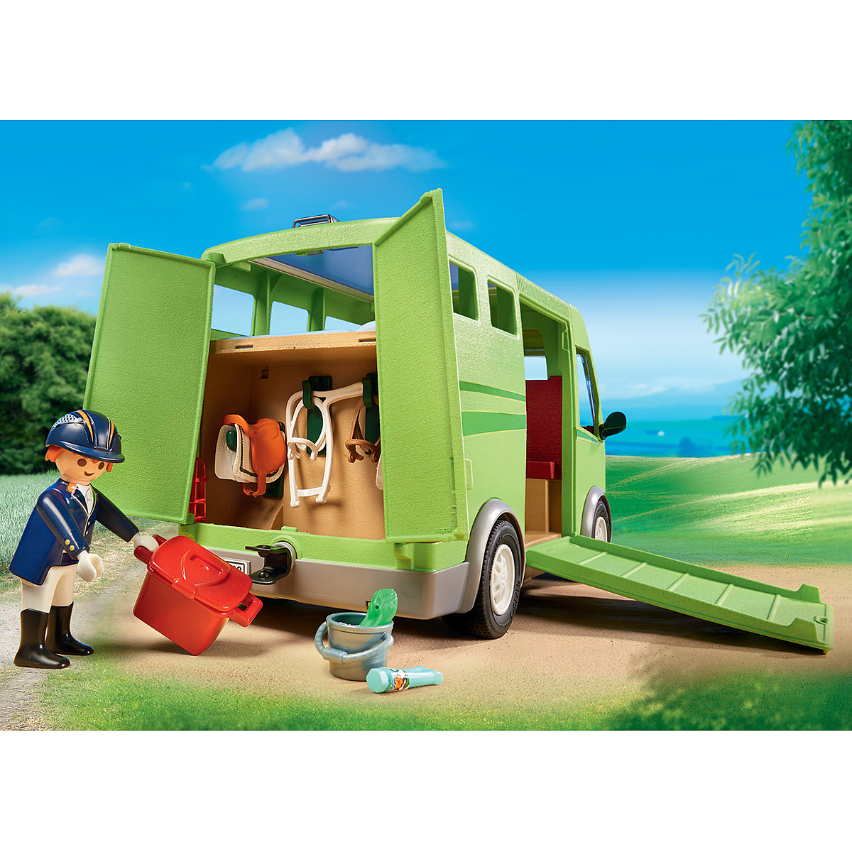 Le van peut accueillir deux chevaux, ainsi que deux couchettes et de nombreux autres accessoires. Contient un personnage, un cheval et des accessoires.