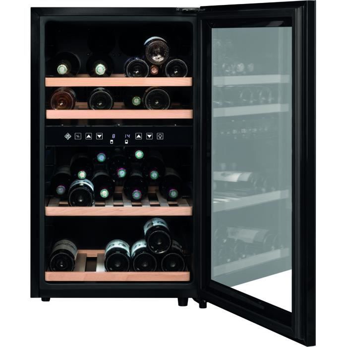 | Plus produit | Double zone indépendantes, compresseur anti-vibrations, éclairage LED, porte vitrée anti-UV, 4 clayettes en hêtre semi-coulissantes |