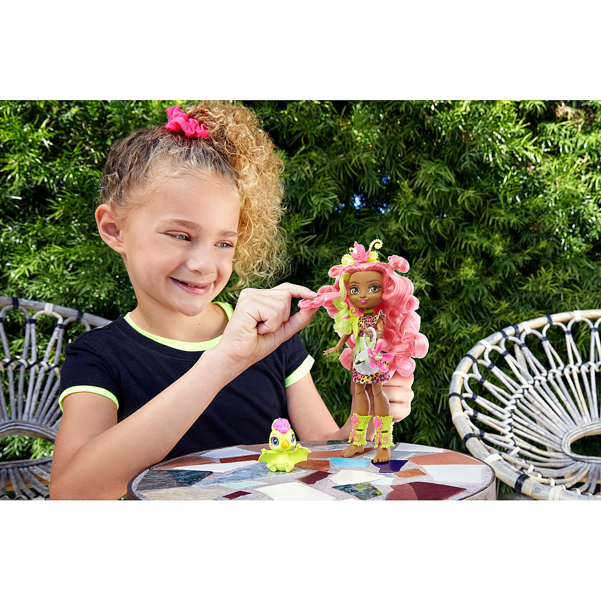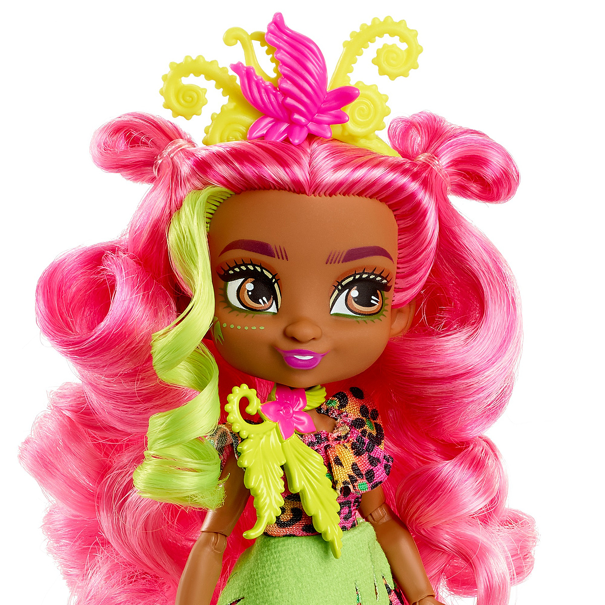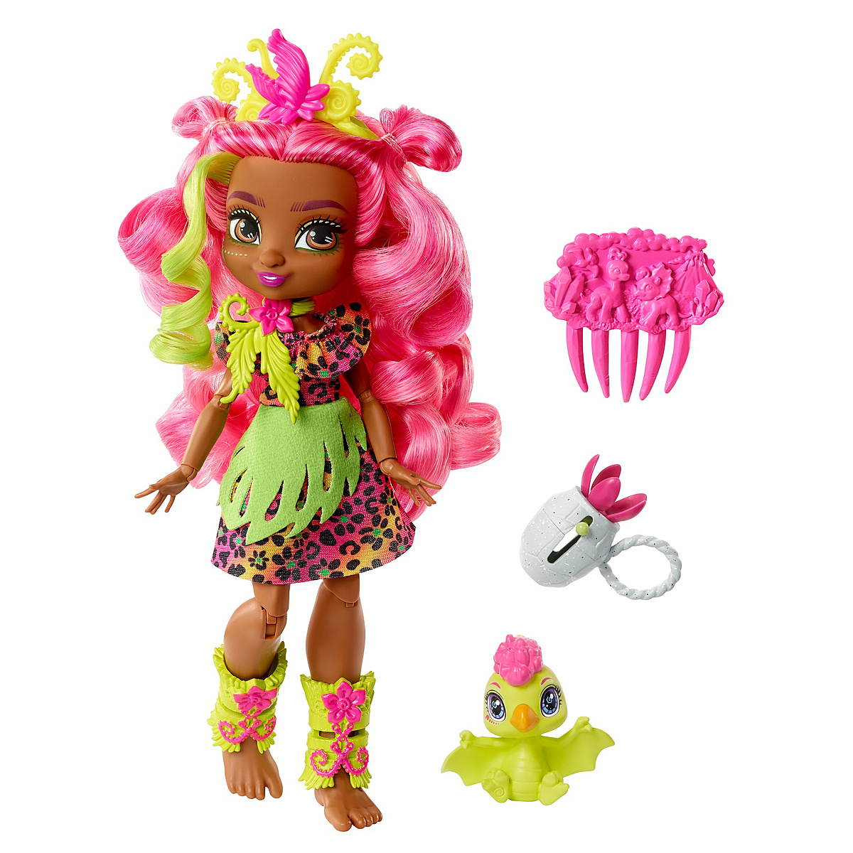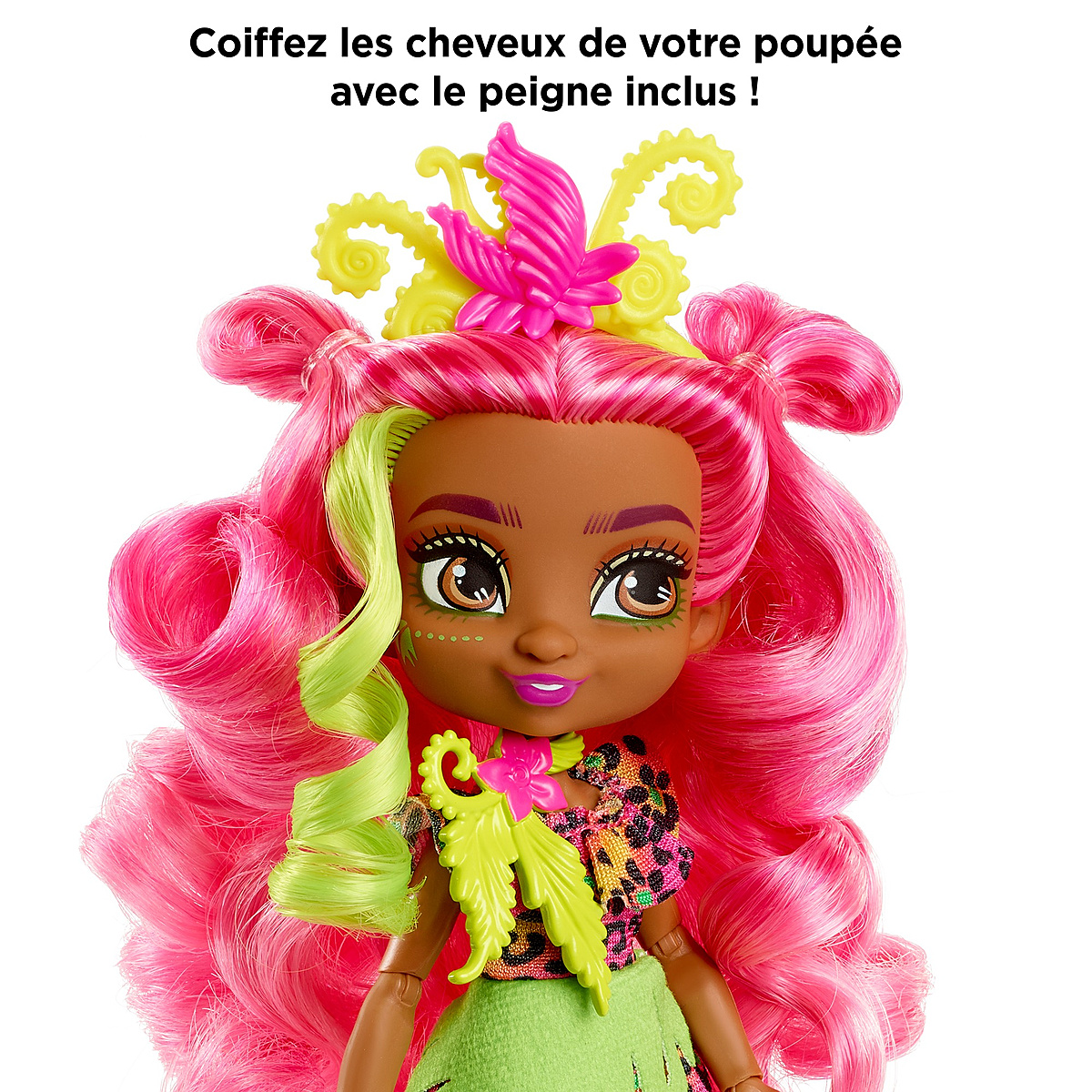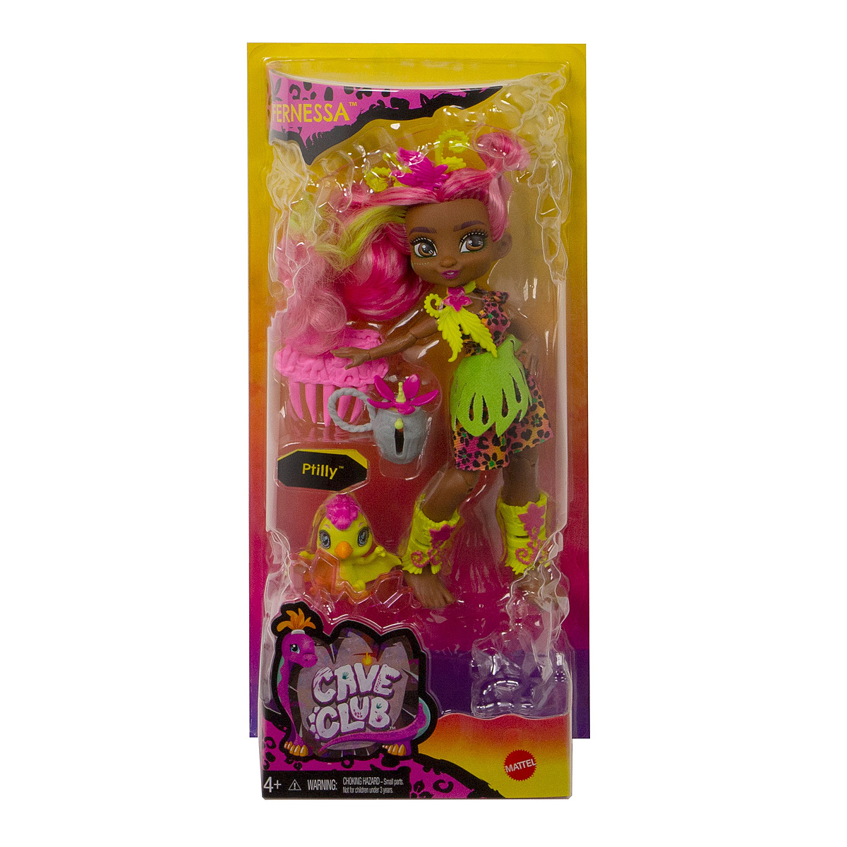 Découvrez Cave Club, un groupe denfants de la Préhistoire à la personnalité décoiffante et très en avance sur leur temps ! Fernessa, accompagnée de son dinosaure de compagnie, Ptilly, se passionne pour la nature ! Elle porte une robe tachetée et des détails rappelant sa passion, comme un serre-tête en forme de dionée attrape-mouche. Inclut 1 peigne, 1 sac à main qui « fleurit » quand on appuie sur le levier ! Poupée articulée au niveau des coudes, des poignets et des genoux.