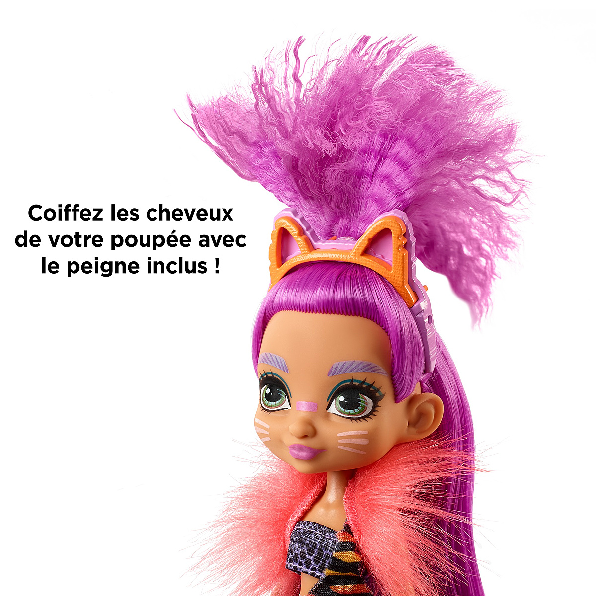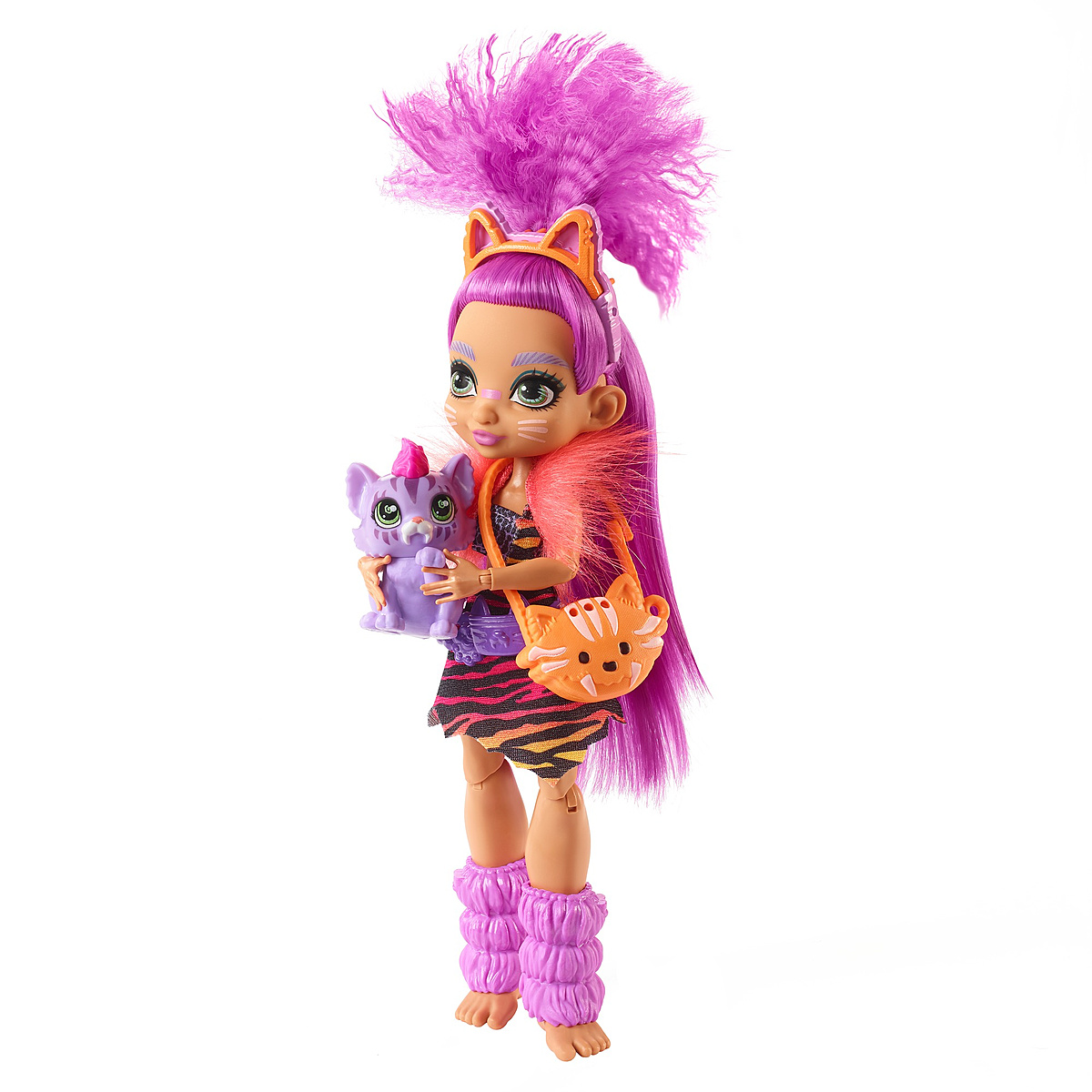 Découvrez Cave Club, un groupe denfants de la Préhistoire à la personnalité décoiffante et très en avance sur leur temps ! Élevée par des tigres à dents de sabre et toujours prête à samuser, Roaralai, accompagnée de son animal de compagnie, Ferrell, arbore un look félin, composé dune robe tigrée et dun boléro effet fourrure. Inclut 1 peigne, 1 sac, 1 serre-tête oreilles de félin détachable. La poupée est articulée au niveau des coudes, des poignets et des genoux.