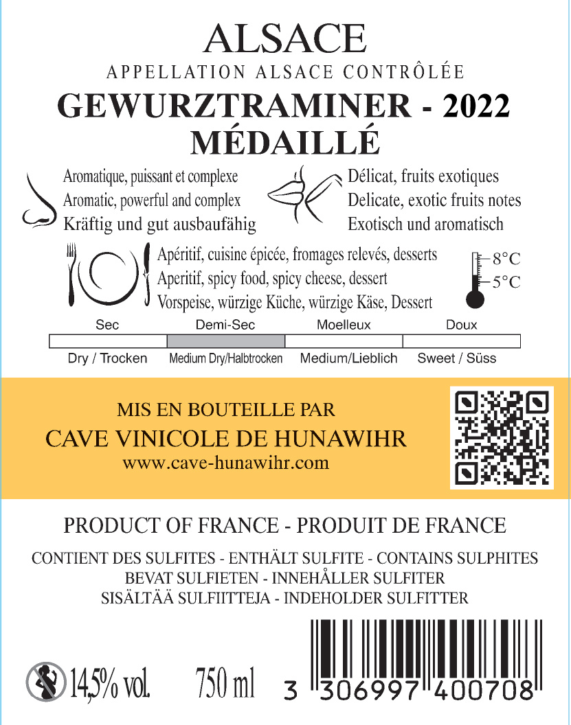 | Libellé | Cave de hunawihr, 2022 - Alsace Gewurztraminer AOP - Blanc Demi-sec - 75 cl |