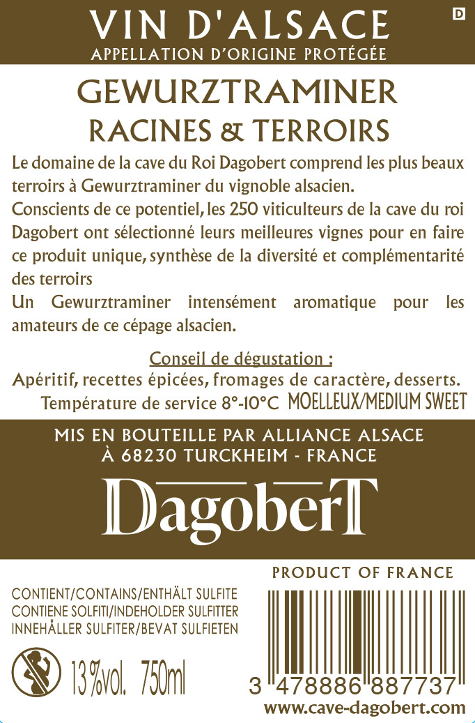 | Libellé | Cave du Roi Dagobert, 2023 - Alsace Gewurztraminer AOP - Blanc Moelleux - 75 cl |