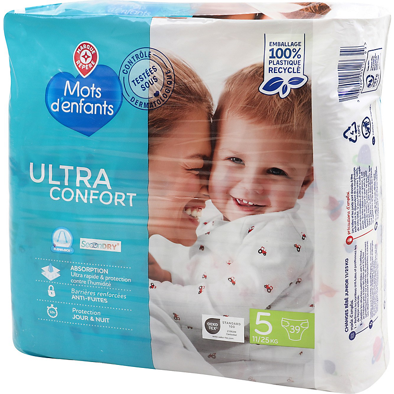 Depuis la naissance de mes jumelles j’ai toujours pris cette marque, depuis que je suis passée à la taille 5 c’est une catastrophe. Des grosses fuites, vêtements tachés, particule transparentes sur la peau de mes enfants, et encore pire avec le paquet de 84 couches !