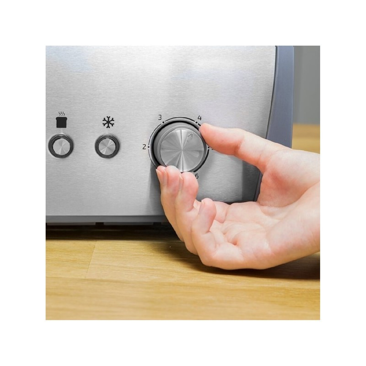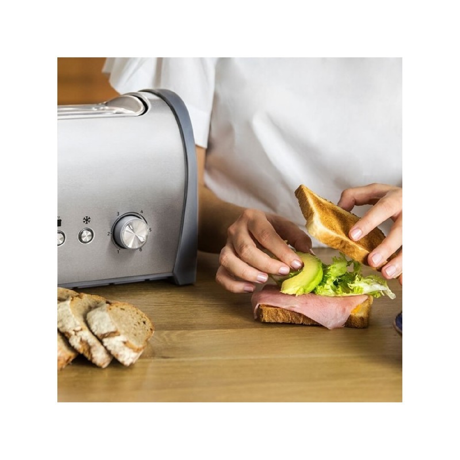 Grille-pain avec deux fentes courtes, capacité pour deux tranches de pain, 800 W et support pour petits pains et viennoiseries. Grille-pain double fente courte avec capacité pour deux tranches de pain. 800 W de puissance. Fente large pour introduire des pains épais ou de grande taille. Finitions en acier inoxydable. Baguettes supérieures pour aider à réchauffer les aliments de grande taille comme des viennoiseries, des gâteaux ou des croissants. Puissance ajustable, 6 positions pour toaster et obtenir un résultat selon vos goûts. Fonctions préconfigurées : Réchauffer et Décongeler. Plateau ramasse-miettes, facile à extraire et espace range-câbles. Mécanisme de déconnexion et pop-up automatique. Expulsion automatique du pain lorsque le programme termine. Système d’auto-centrage pour toaster les deux côtés du pain plus uniformément. Bouton Annuler pour interrompre le processus de grillage du pain. Grille-pain Support pour petits pains et viennoiserie. Manuel d’instructions .