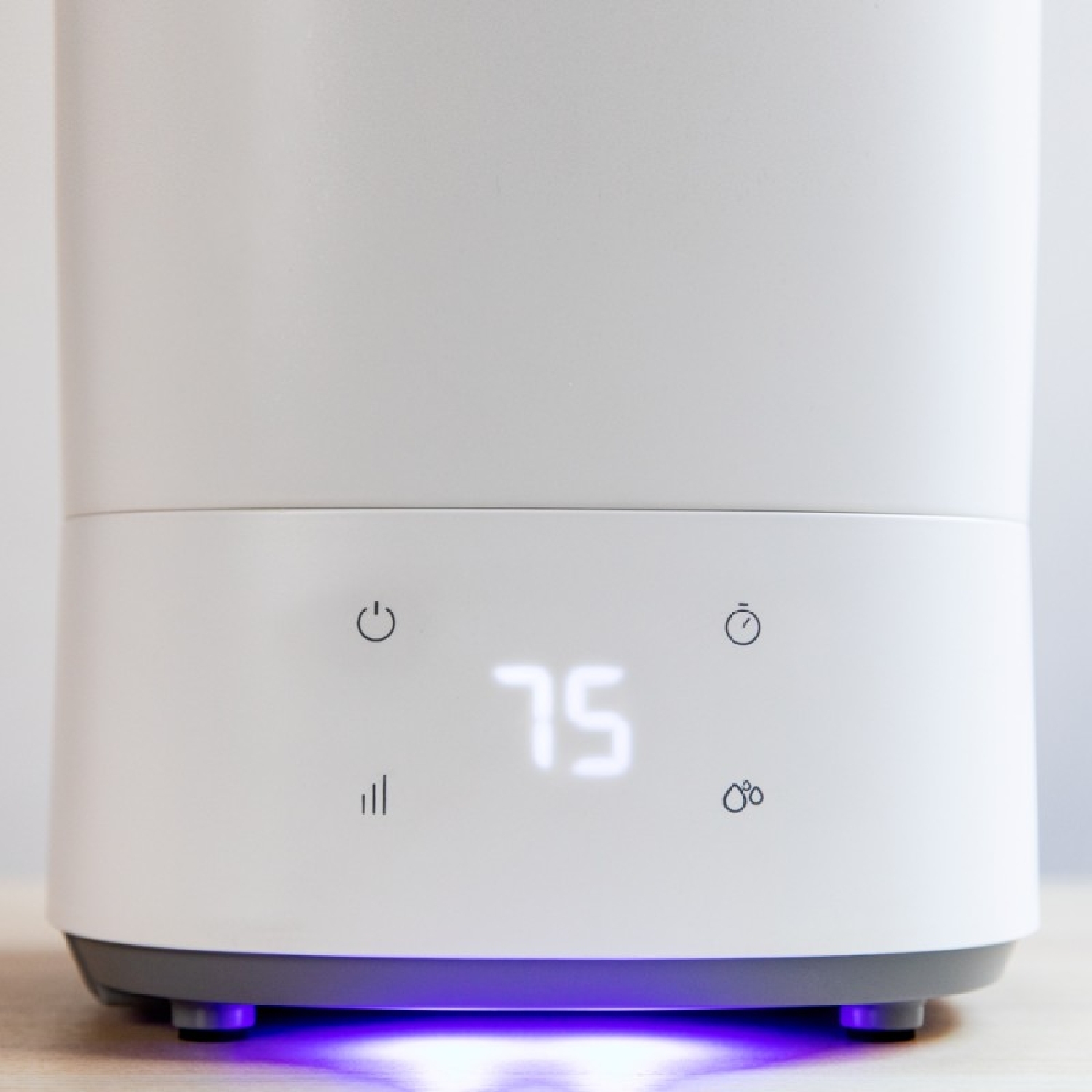 Humidificateur d’eau de 330 ml/h et réservoir de 5,5 L. 330 ml/h d’humidification maximale, un total de 8 litres d`eau par jour qui améliorera la qualité de l`environnement de votre maison. Son grand pouvoir de déshumidification prévient les démangeaisons des yeux, l`irritation des voies respiratoires et de leurs muqueuses et la sécheresse de la peau. Grâce à son grand réservoir d’eau de 5,5 L, vous pourrez utiliser l’humidificateur de manière prolongée sans que vous deviez le remplir. Sélectionnez et contrôlez le pourcentage d’humidité souhaité, de 30 % à 90 %, grâce à son hygrostat, ce qui permet de personnaliser l’ambiance de votre maison. L’humidificateur possède un filtre en céramique capable de retenir les particules les plus grandes présentes dans l’eau, comme le calcaire, et combattre la mauvaise odeur qui provoque l’eau plate. Avec la vitesse maximale, cet humidificateur est capable d’atteindre jusqu’à 30 m² de surface. Humidifiez facilement une pièce ou une petite salle à manger. Humidifiez toute votre maison pendant un jour complet grâce à son autonomie de 24 heures. Il vous faudra que remplir le réservoir qu’une fois par jour. Contrôle tactile de toutes les fonctions de l’humidificateur. Utilisez-le en toute simplicité. Il possède 3 vitesses : faible avec 230 ml/h d’évaporation ; moyenne avec 280 ml/h et élevée 330 ml/h. Adaptez le pouvoir d’humidification à vos besoins. Il possède une minuterie programmable avec un maximum de 12 heures. Son fonctionnement sera plus autonome. Son élégant écran LED affiche le niveau d’humidité présent dans l’air, ainsi que les réglages d’humidité sélectionnés. Utilisez le mode Nuit pour que l’appareil réalise une humidification constante à vitesse minimale et presque sans bruit. Une faible lumière bleue s’allumera. Utilisez-le aussi pour vos séances d’aromathérapie grâce à qu’il possède un petit compartiment pour que vous ajoutez les arômes souhaités. Il possède un système de sécurité AutoOff qui éteint l’appareil lorsque le réservoir est vide, évitant ainsi l’endommagement du moteur à cause du fonctionnement à vide. La fonction 360 º permet à l’humidificateur d’humidifier jusqu’au dernier recoin de votre maison. 30 W de puissance pour que le processus d’humidification soit maximal mais avec une consommation énergétique minimale. L’humidificateur possède seulement 30 décibels. Utilisez le mode Nuit ou à tout moment. Il possède une poignée pour que vous puissiez le transporter facilement. Poids léger de 1,76 kg. Transport facile entre pièces. Élégant design en blanc mat avec un écran LED. Humidificateur Manuel d’instructions .